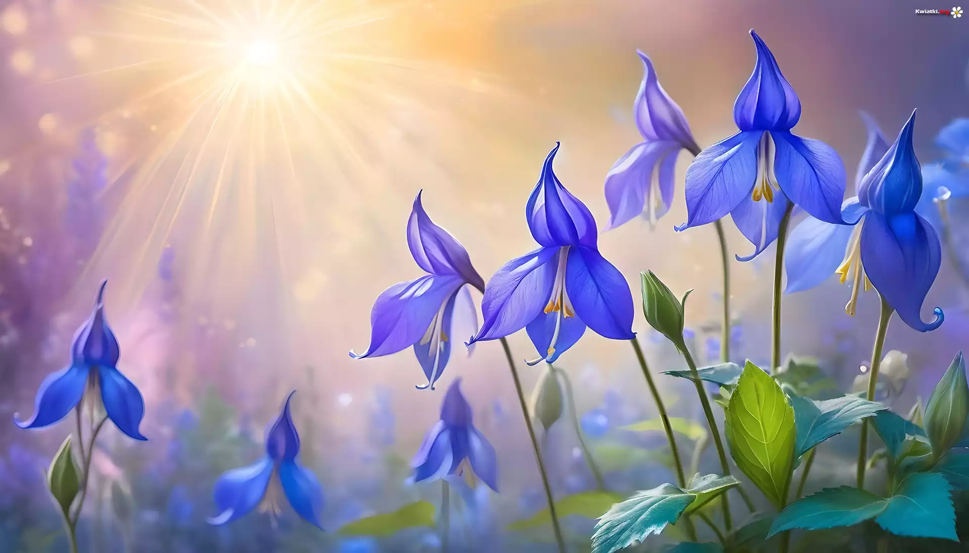 Kwiat Niebieskie, Kwiaty, Promienie słońca, Grafika
