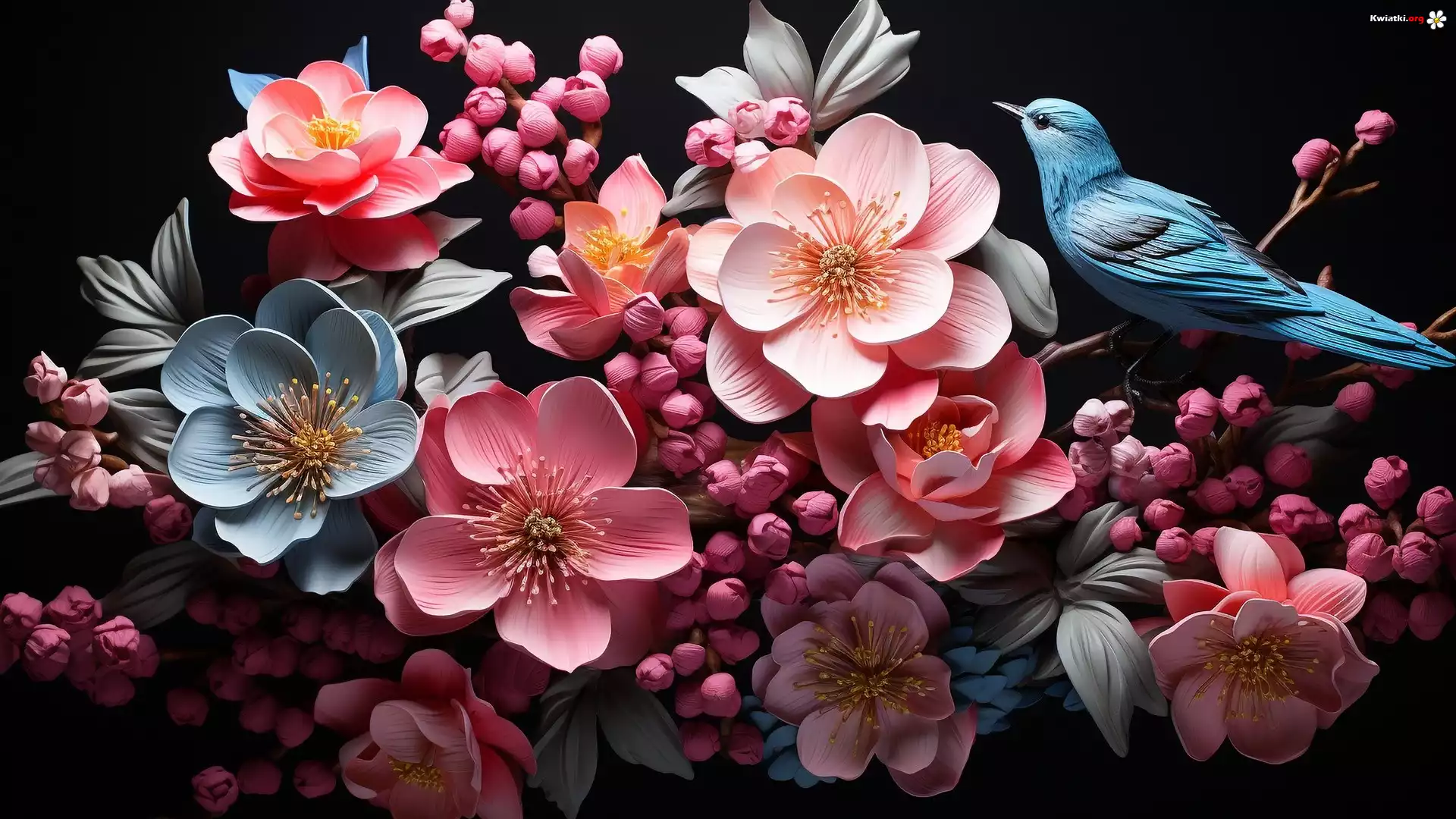 Grafika, Różowe, Niebieskie, Kwiaty, Niebieski, Ptak - Zdjęcia
