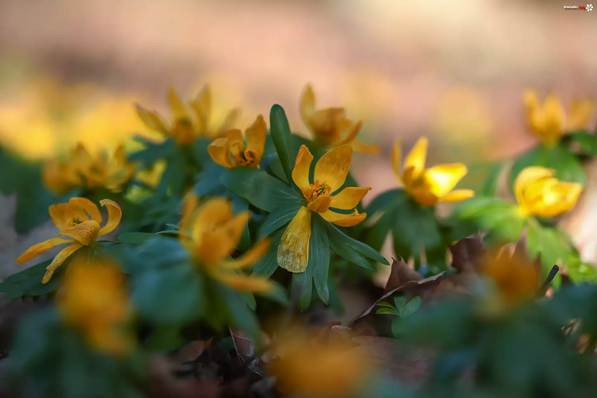 Żółte, Ranniki, Kwiaty, Zbliżenie - Zdjęcia