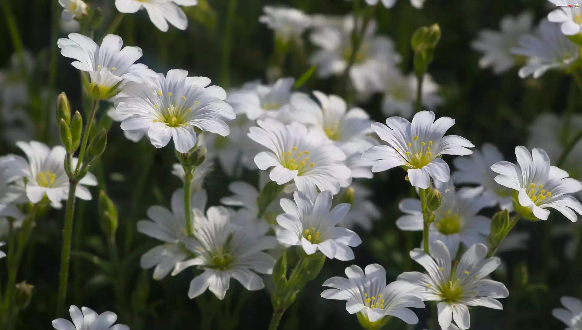 Białe, Kwiaty, Rogownice polne, Zbliżenie - Zdjęcia