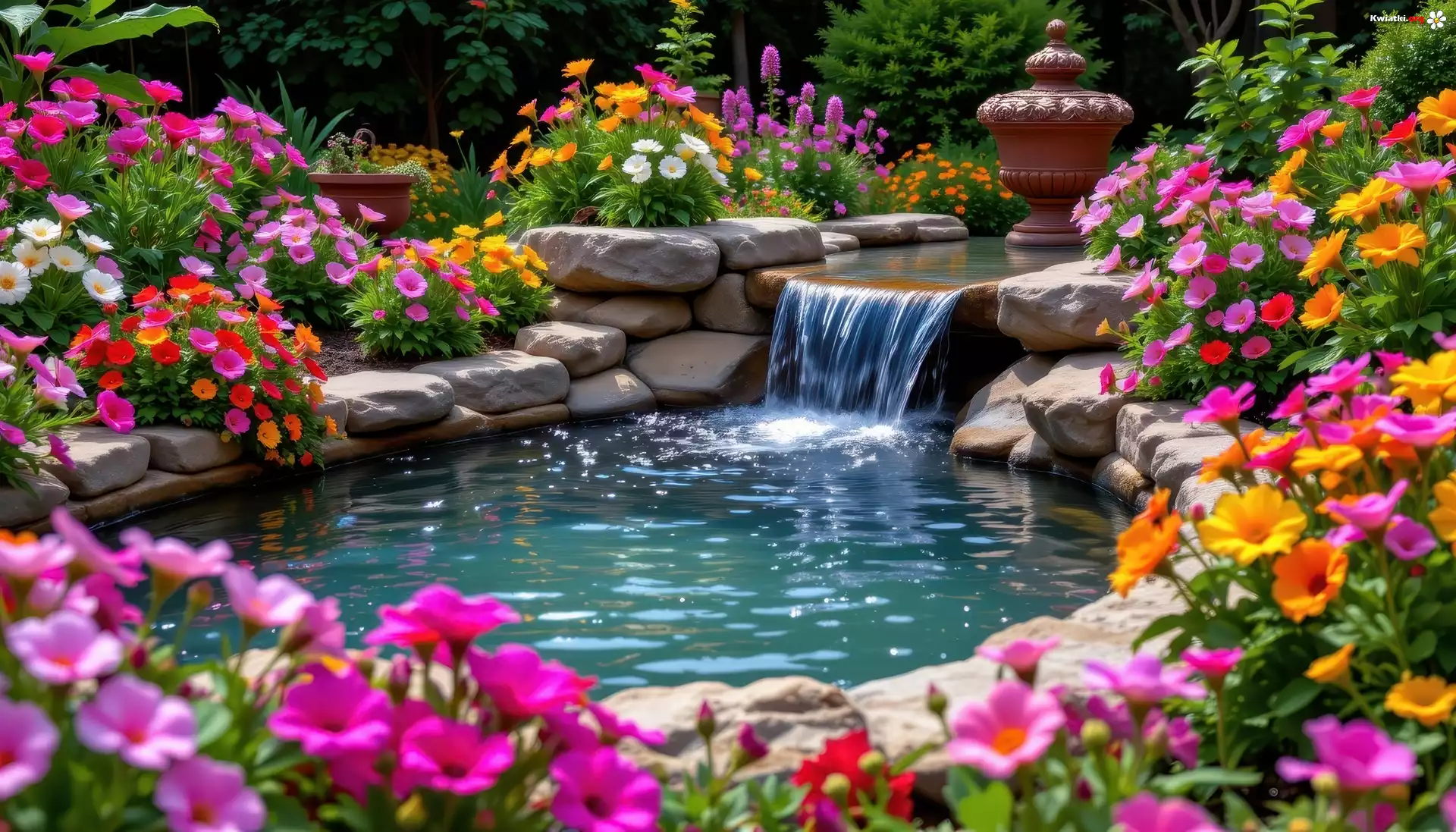 Ogród, Oczko wodne, Kwiaty, Kamienie, Rośliny - Zdjęcia