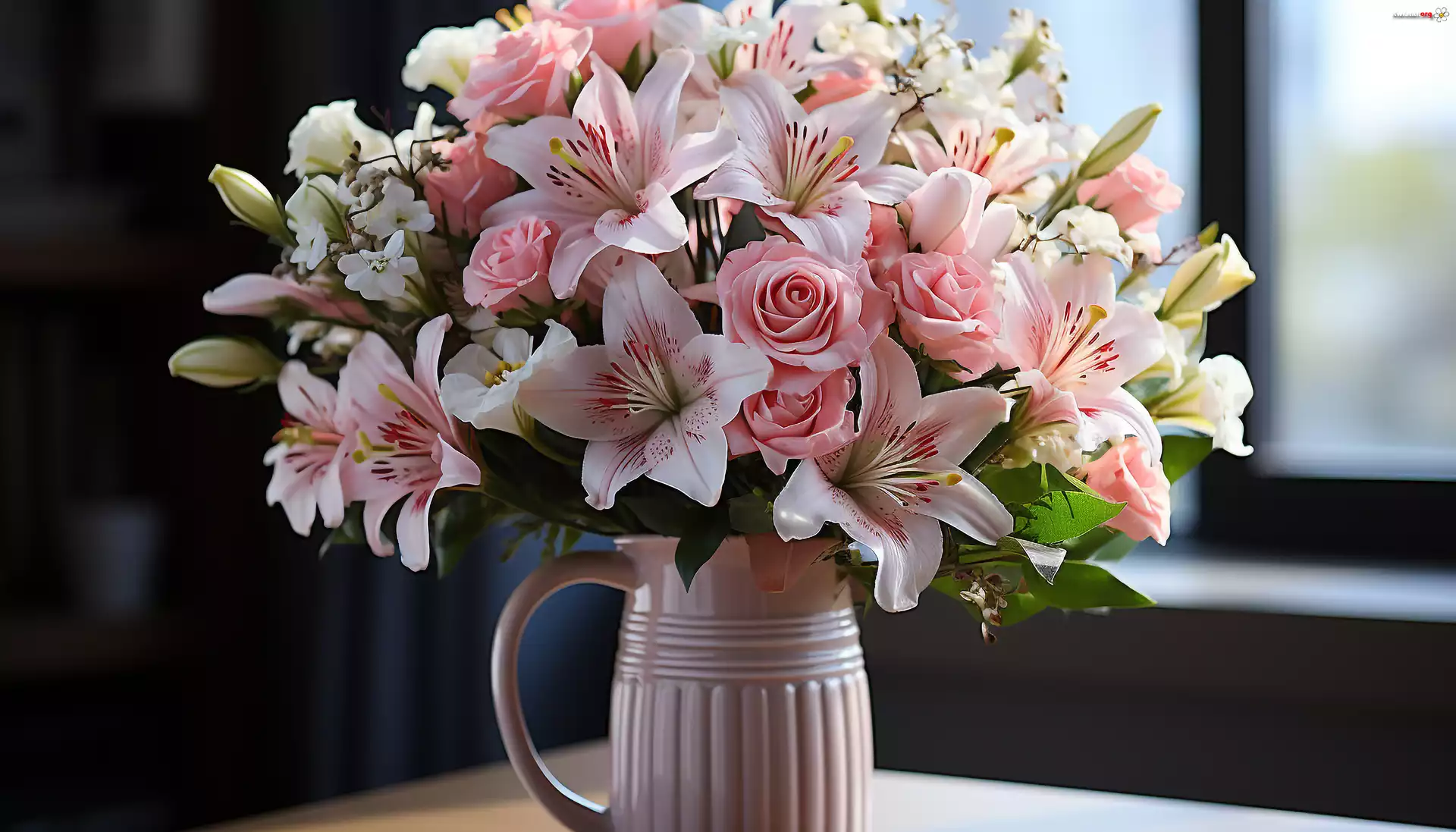 Kwiat Kolorowe, Kwiaty, Róże, Lilie, Dzbanek