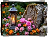 Lampion, Kwiaty, Róże, Aksamitki, Kamień - Zdjęcia
