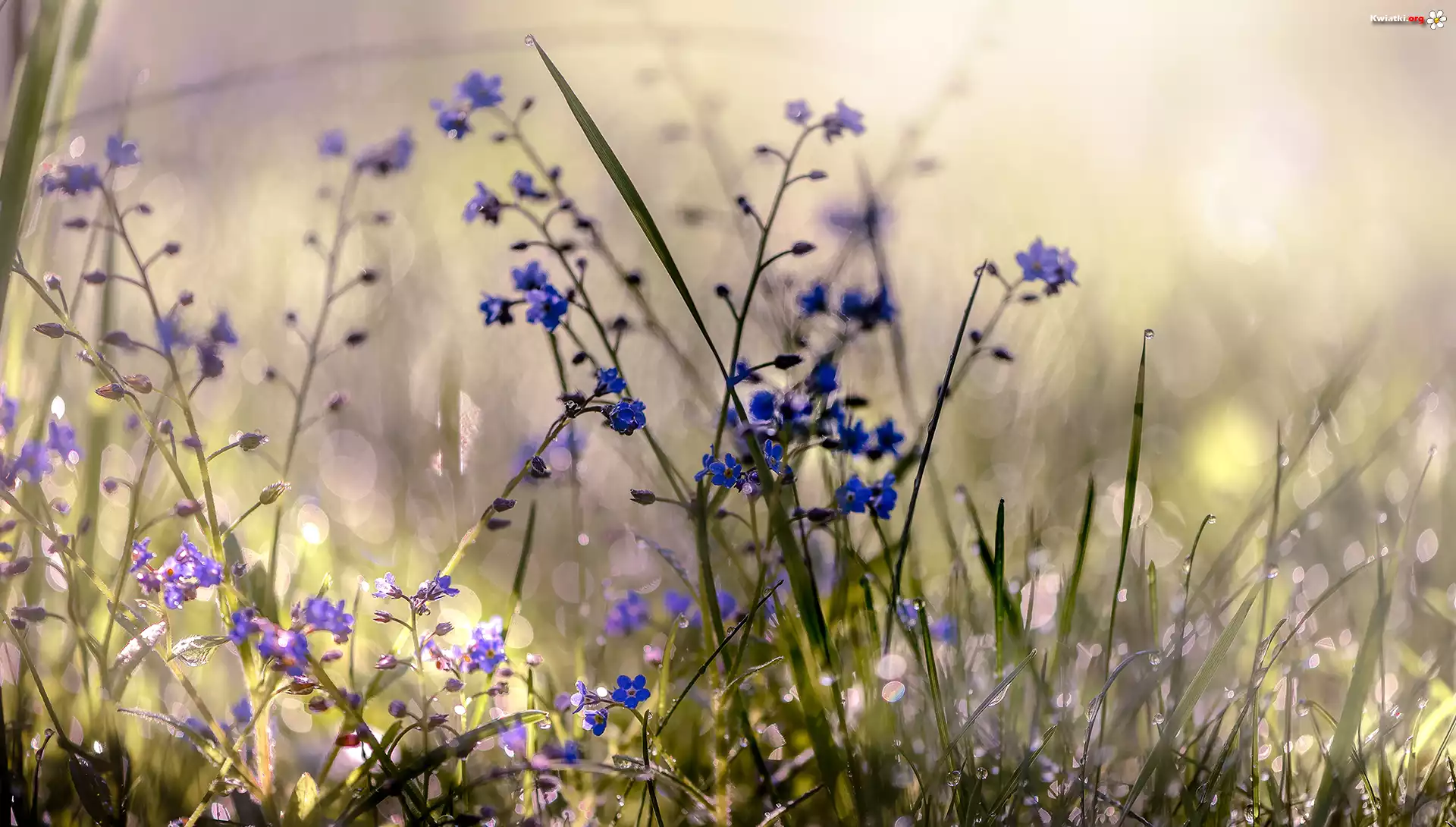 Kwiaty, Niebieskie, Niezapominajki, Trawa, Rozmycie, Rosa - Zdjęcia