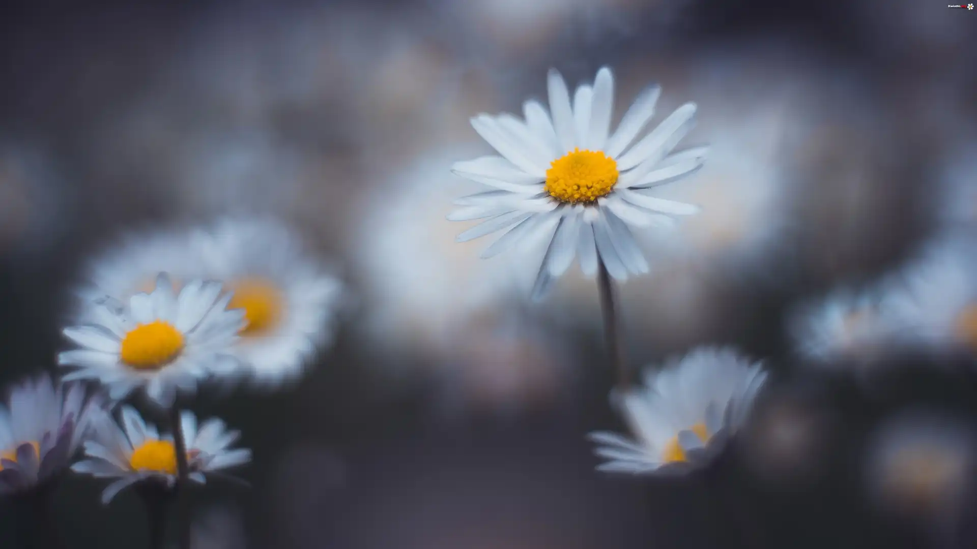 Kwiaty, Białe, Stokrotki, Rozmyte tło - Zdjęcia