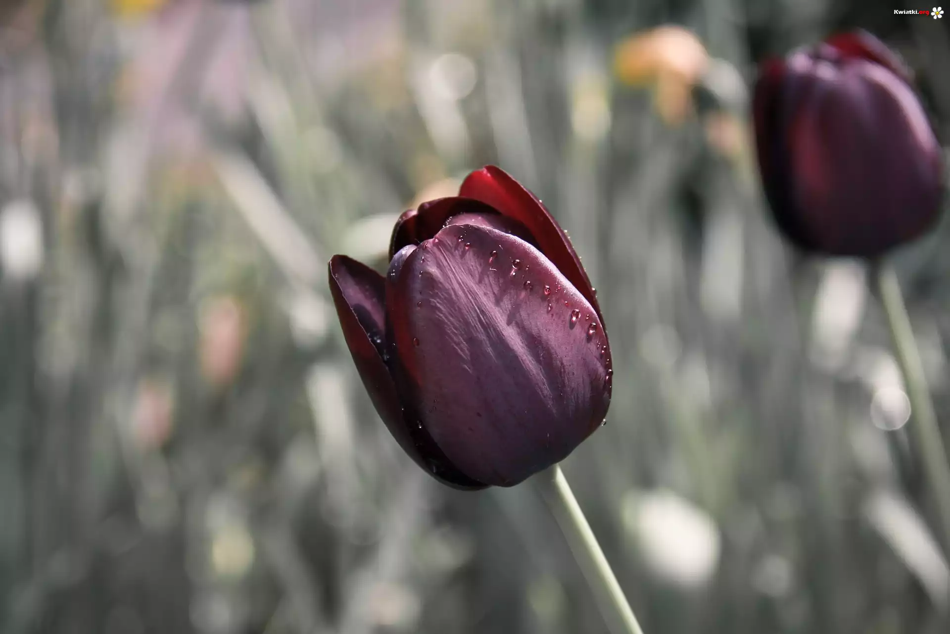 Kwiaty, Bordowy, Tulipan, Krople, Rozmyte tło - Zdjęcia