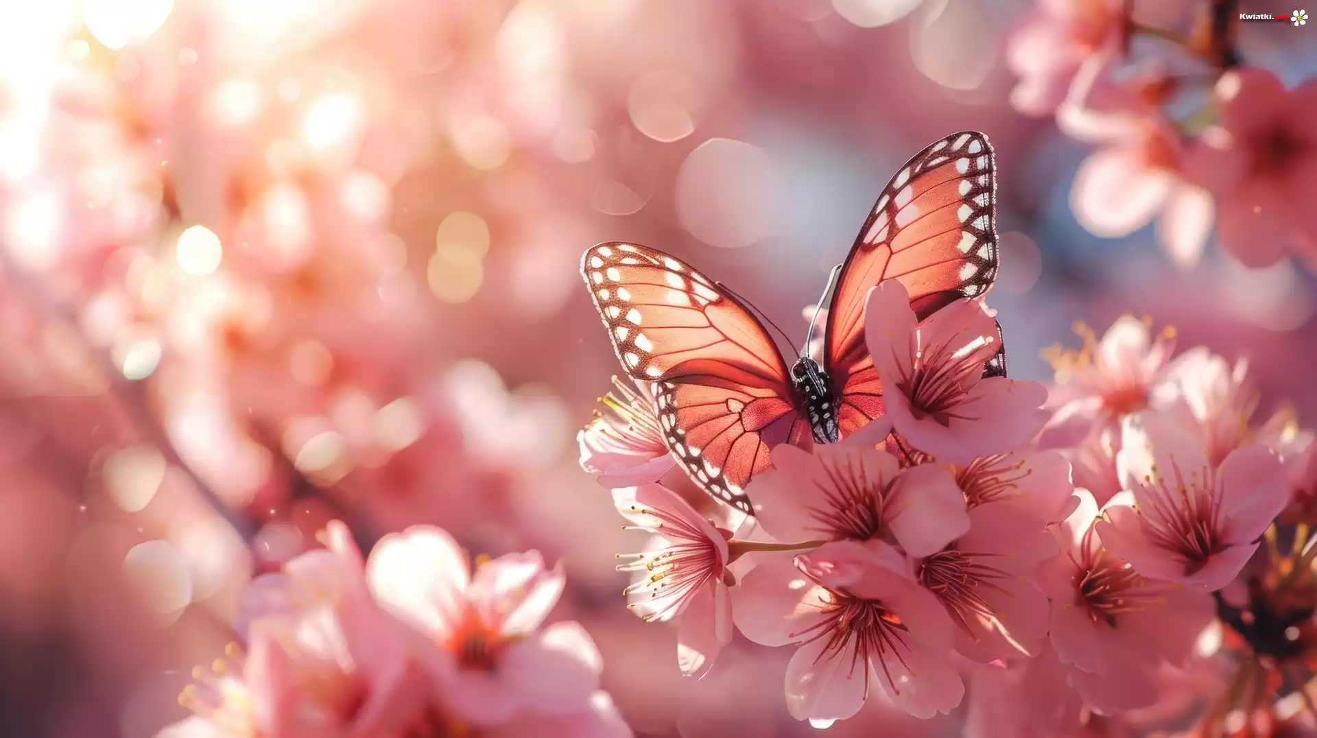 Różowe, Kwiaty, Różowy, Motyl, Grafika - Zdjęcia