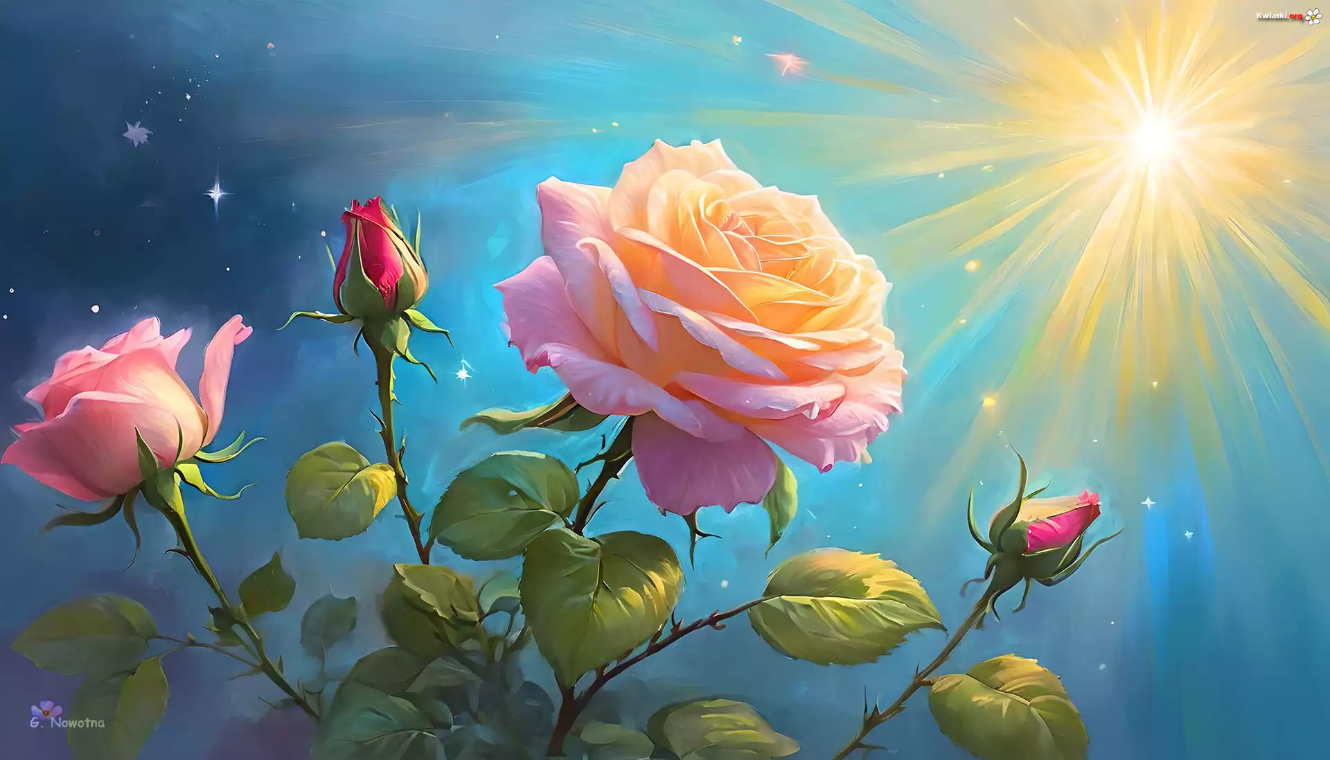 Kwiat Różowe, Róże, Rozwinięte, Kwiaty, Pąki, Słońce, Grafika