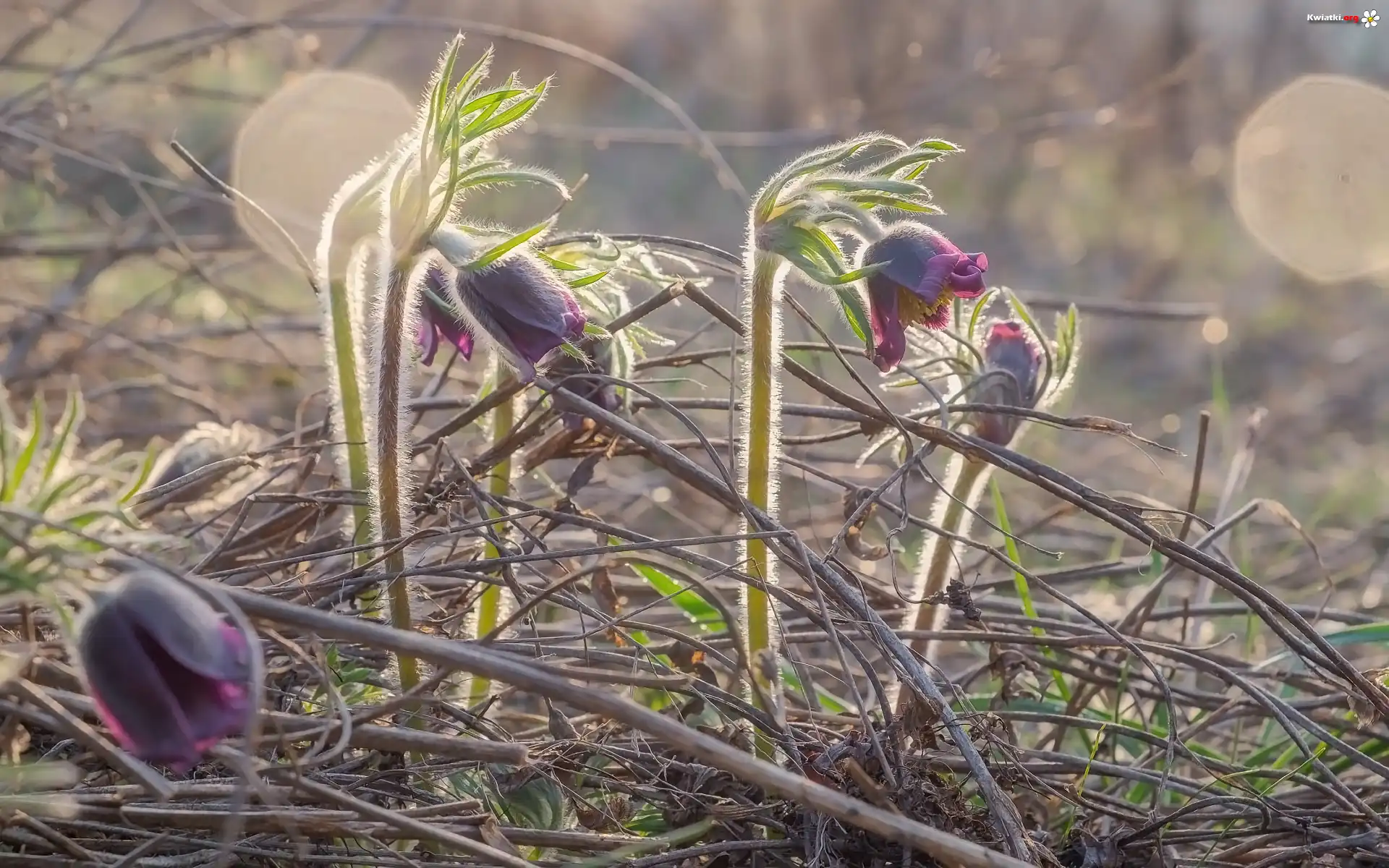 Kwiaty, Rozkwitające, Sasanki, Trawa - Zdjęcia