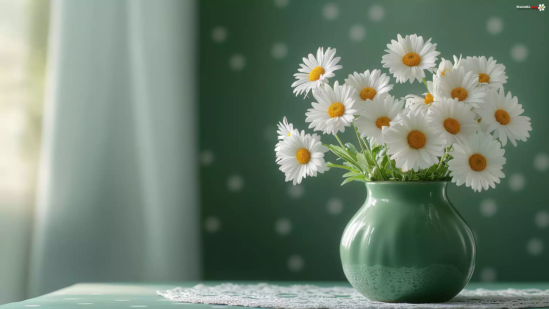 Kwiaty, Białe, Rumiany, Bukiet, Zielony, Wazon, Serwetka, Stół, Ściana, Zasłona - Zdjęcia