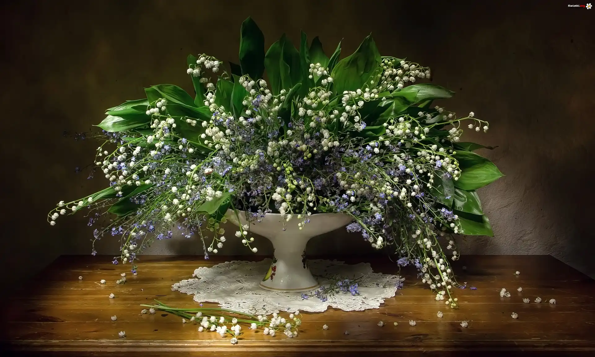 Kwiaty, Niezapominajki, Konwalie, Serweta, Wazon - Zdjęcia