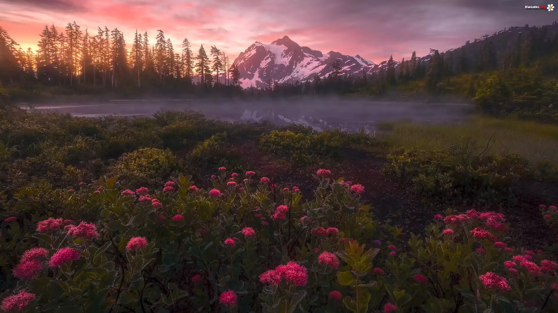 Kwiat Las, Kwiaty, Drzewa, Góry, Mgła, Staw, Zachód słońca