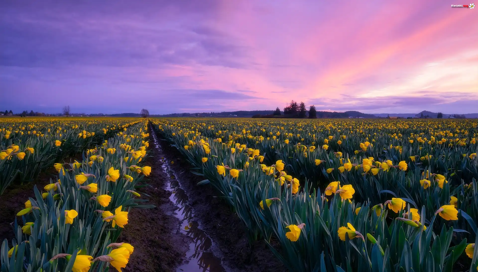 Kwiat Plantacja, Kwiaty, Żółte, Narcyzy żonkile, Drzewa, Zachód słońca