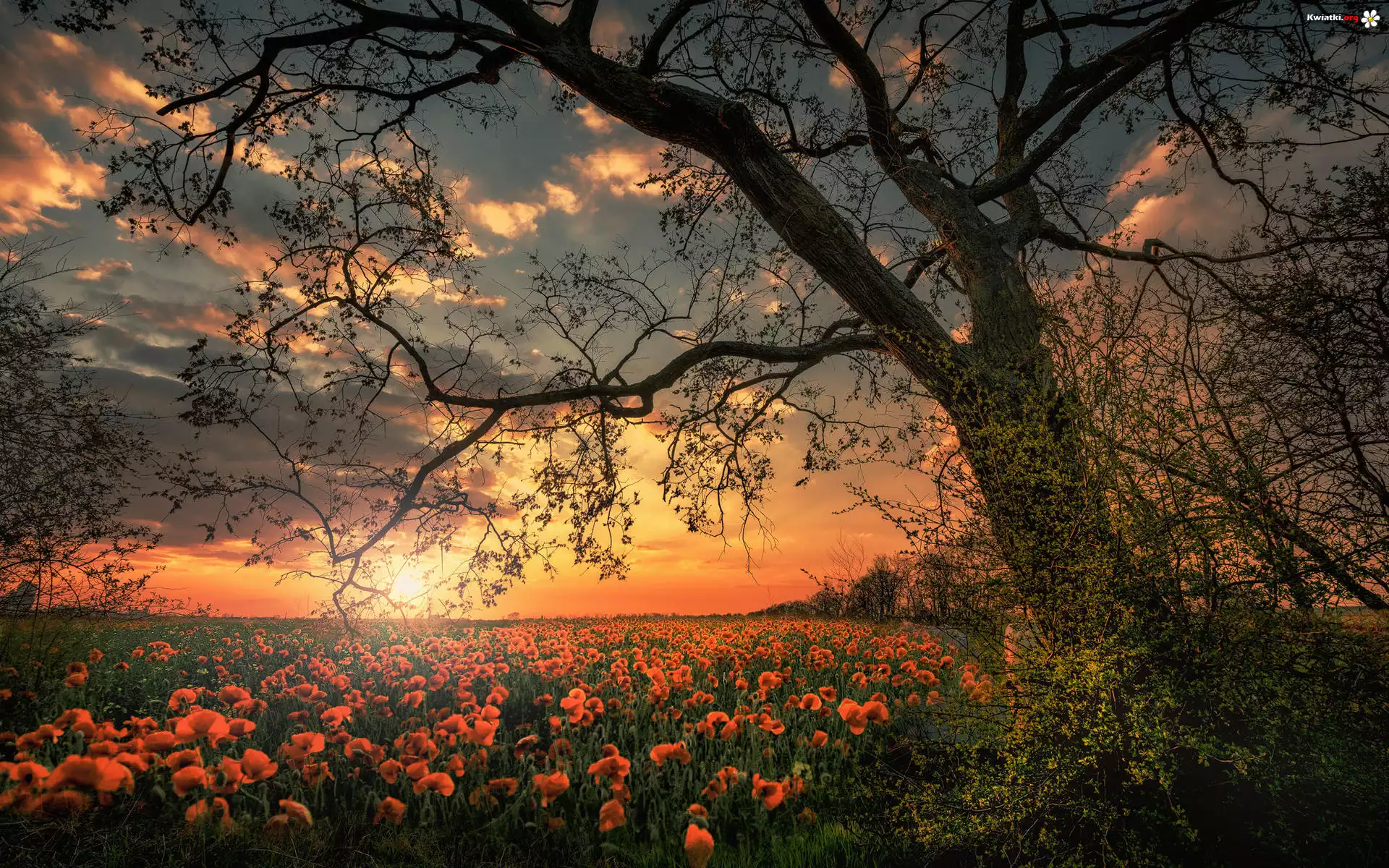 Kwiat Pole, Kwiaty, Maki, Drzewo, Gałęzie, Chmury, Zachód słońca