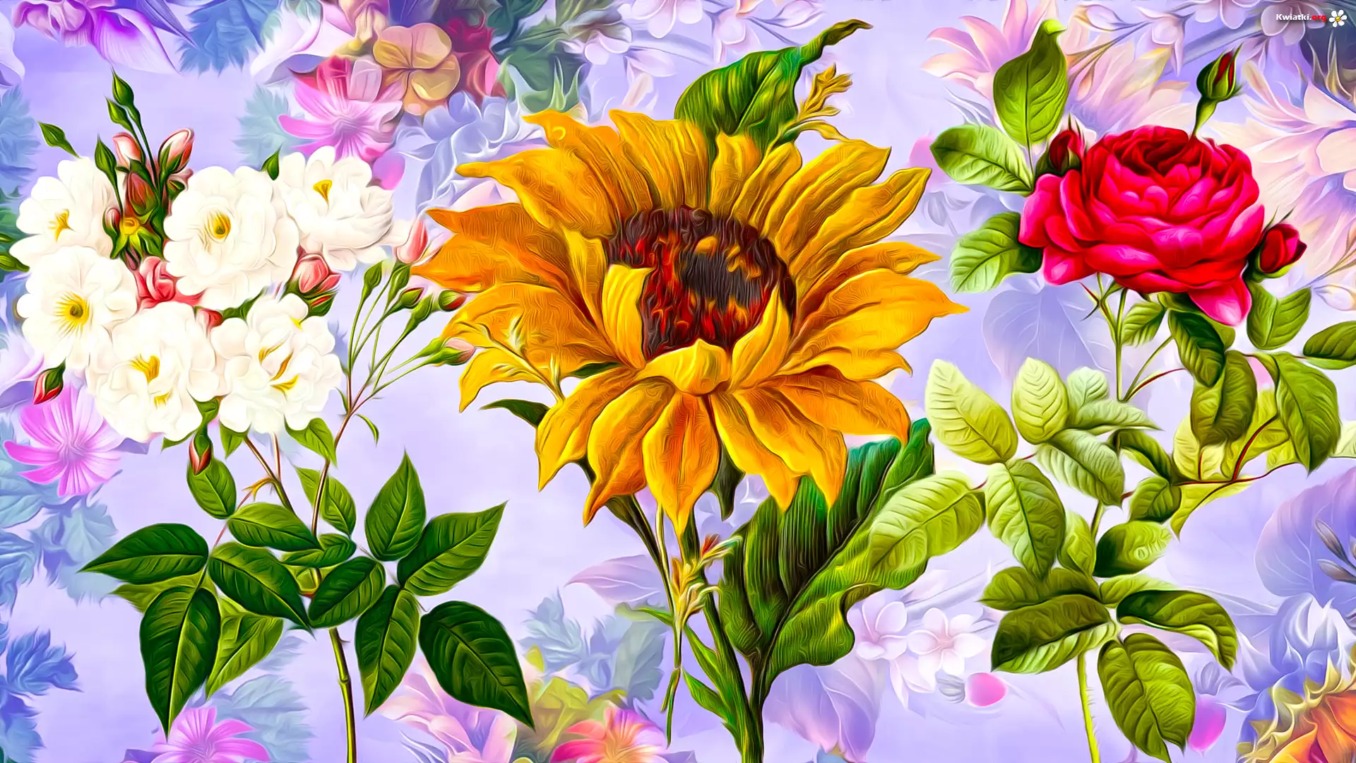 Kwiaty, Róże, Słonecznik, Grafika - Zdjęcia