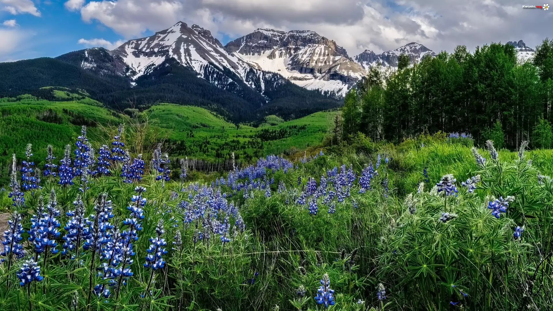 Kwiaty, Łubin, Drzewa, Góry, Pasmo, Stormy Sneffels, Kolorado, Stany Zjednoczone - Zdjęcia