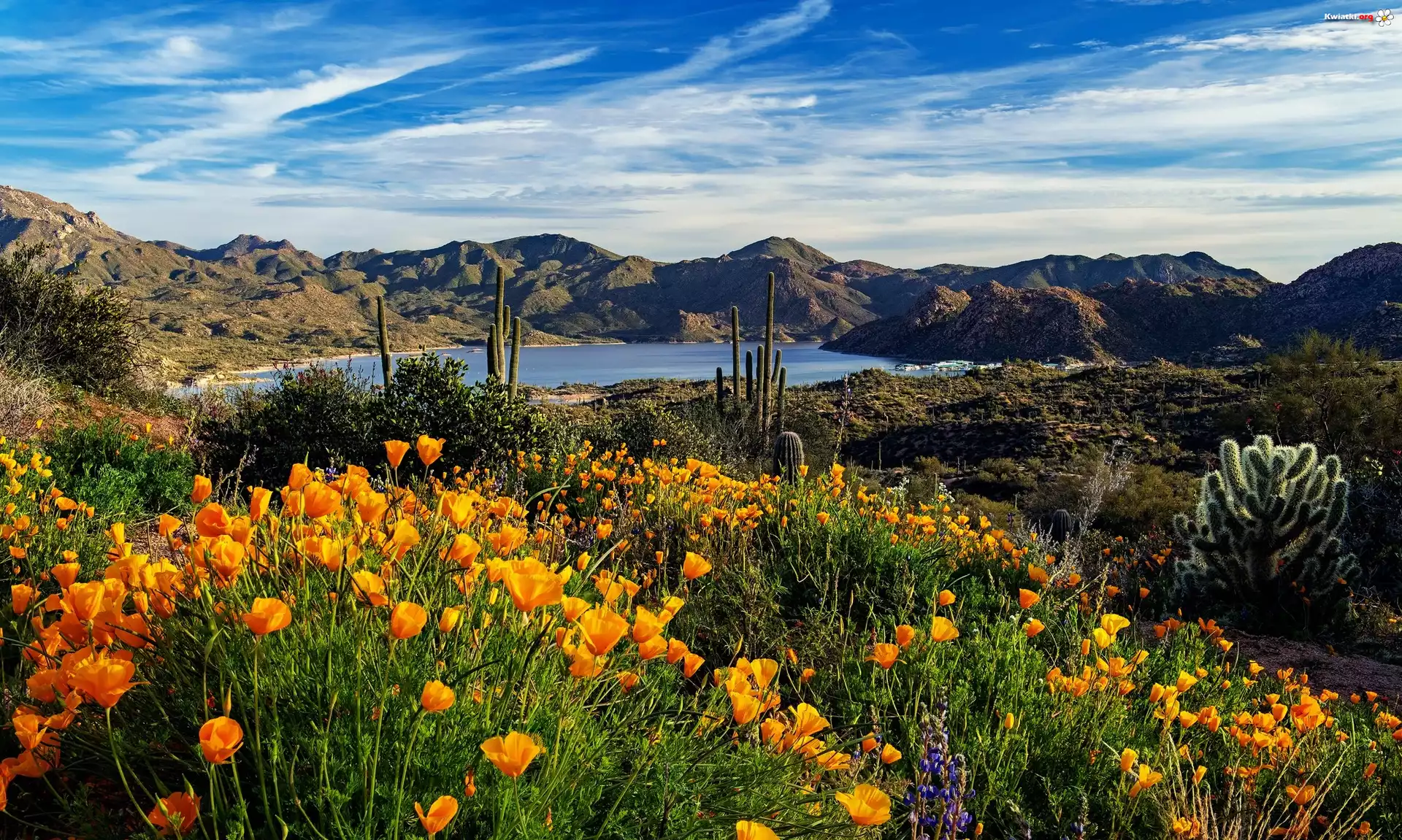 Kwiaty, Pozłotki kalifornijskie, Kaktusy, Jezioro Bartllet, Góry, Arizona, Stany Zjednoczone - Zdjęcia |