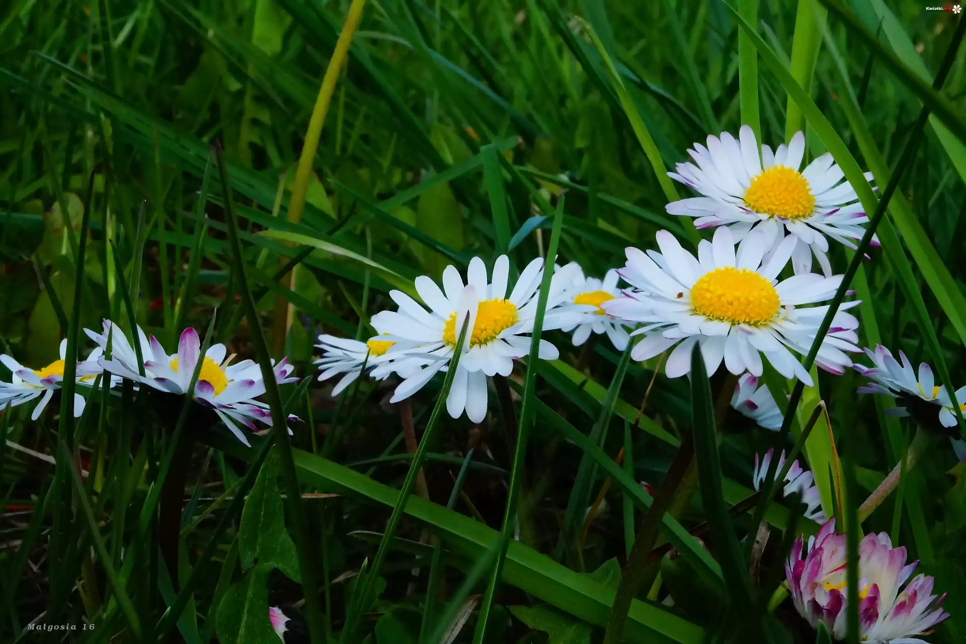 Kwiaty, Wiosenne, Stokrotki, Trawa - Zdjęcia