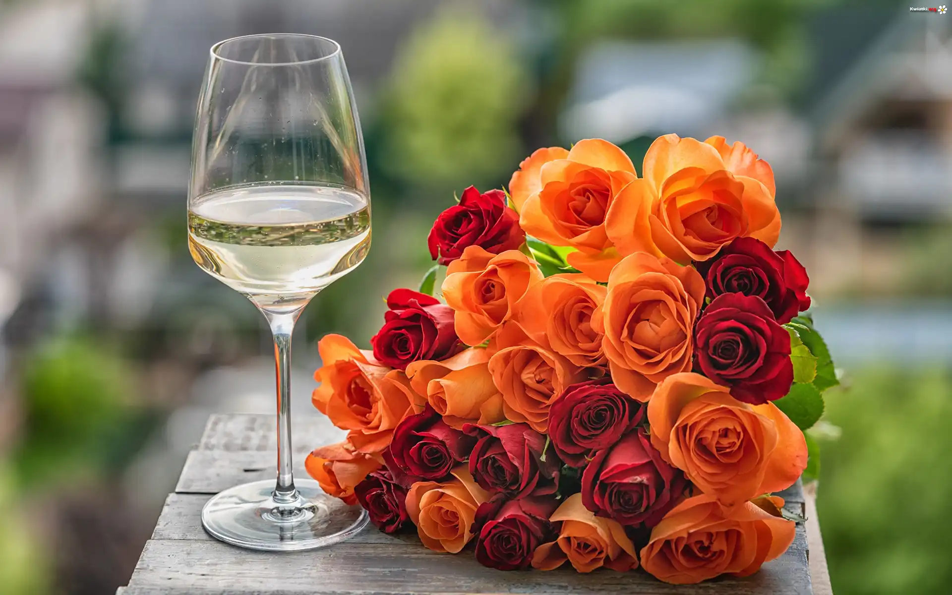 Kwiaty, Bukiet, Dwukolorowe, Róże, Stolik, Kieliszek - Zdjęcia