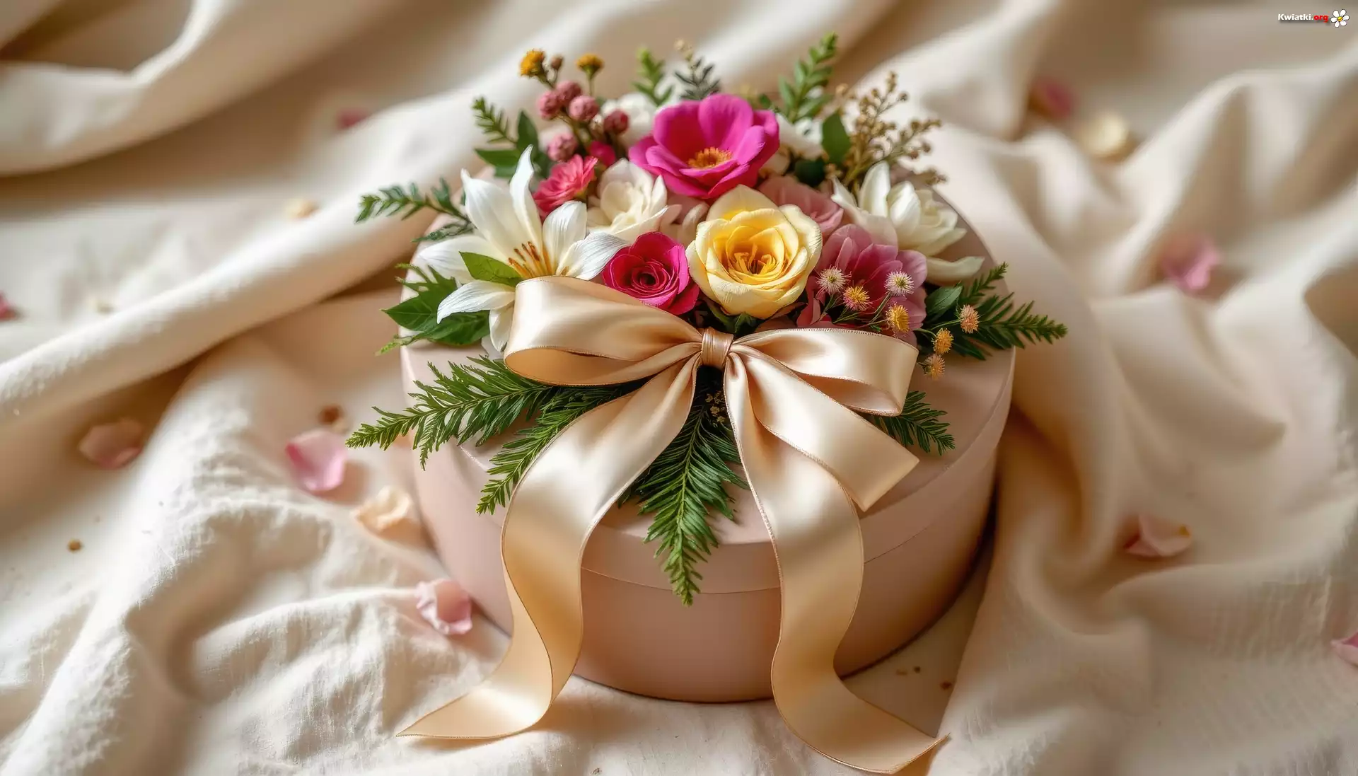 Okrągłe, Pudełko, Prezent, Kwiaty, Kokarda, Tkanina - Zdjęcia