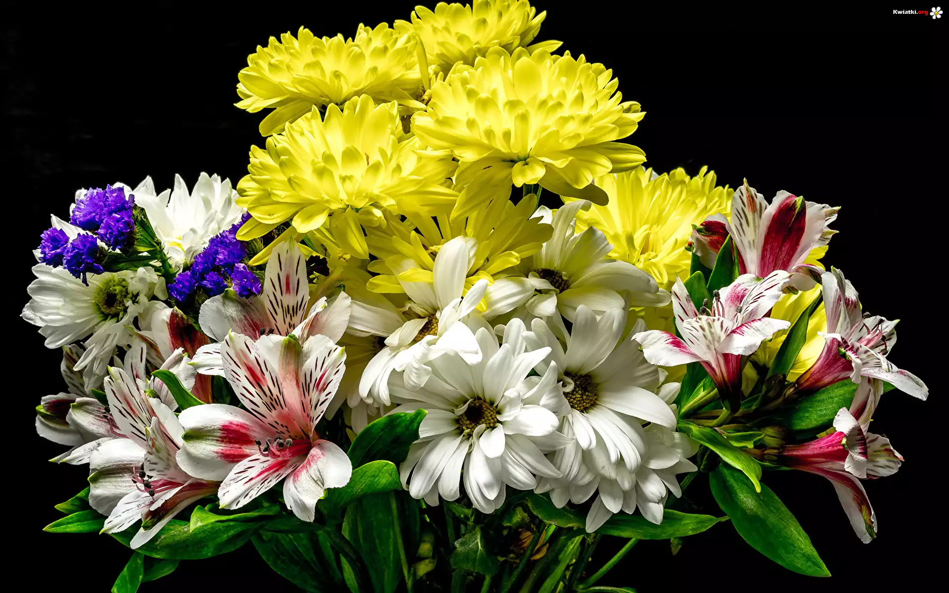 Kwiat Kwiaty, Chryzantemy, Alstremerie, Czarne tło, Bukiet