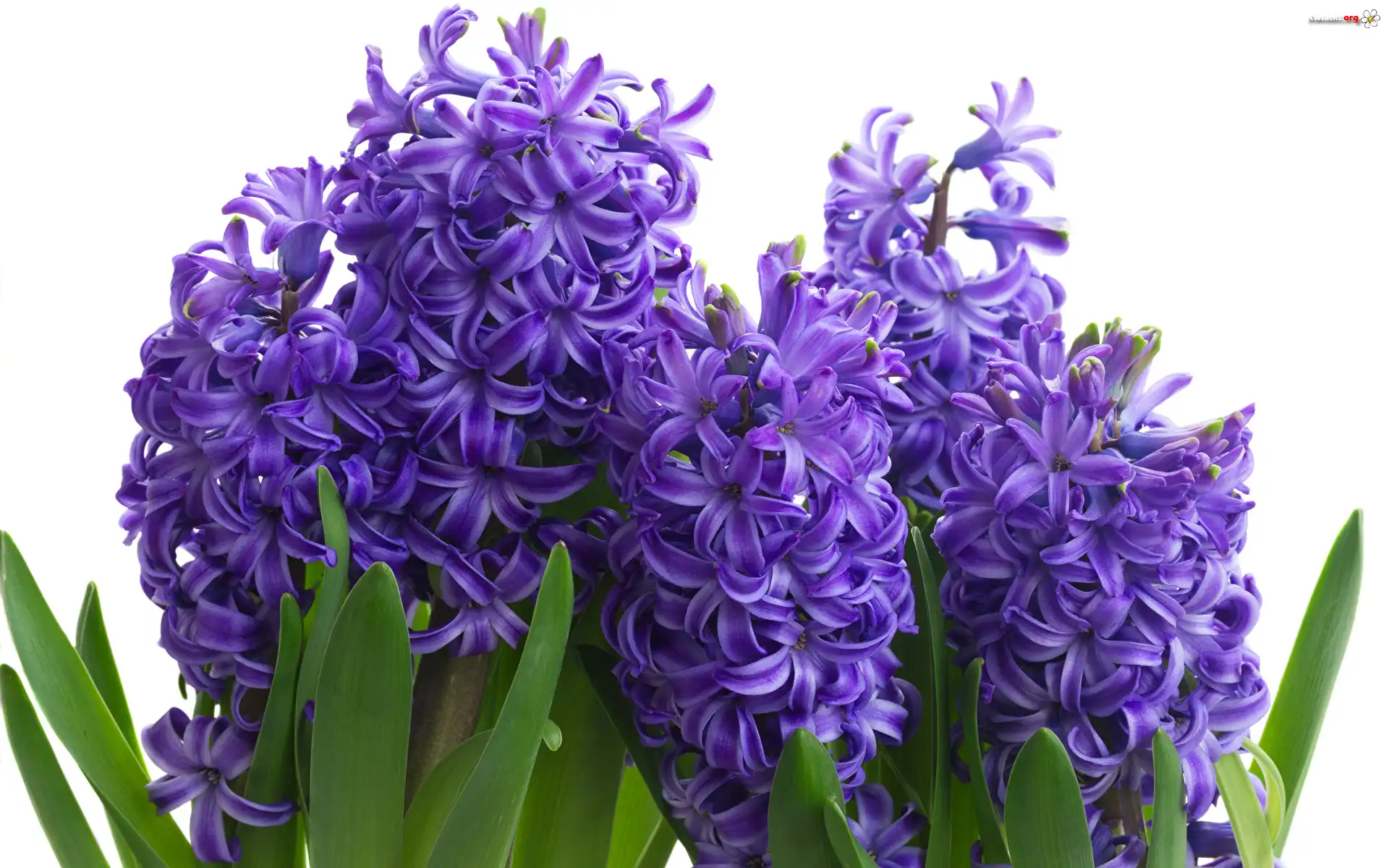 Kwiaty, Hiacynty, Niebieskie, Liście, Tło białe - Zdjęcia