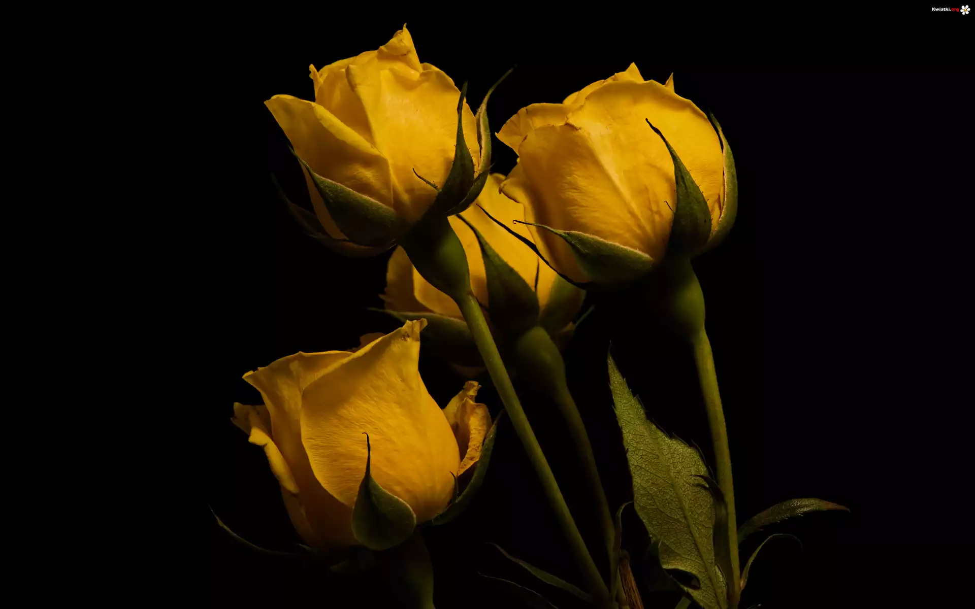 Kwiaty, Cztery, Żółte, Róże, Tło czarne - Zdjęcia