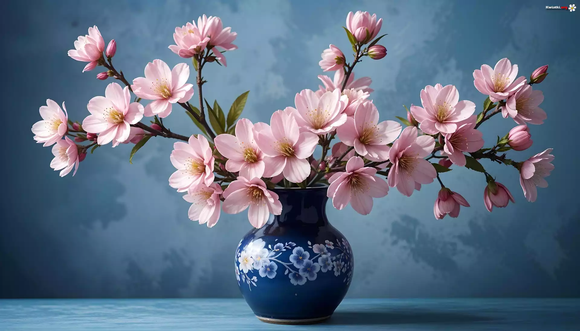 Wazon, Gałązki, Różowe, Kwiaty, Niebieskie, Tło - Zdjęcia