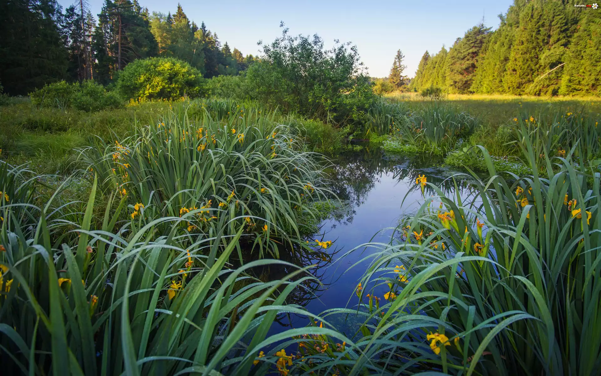 Trawa, Kwiaty, Irysy wodne, Staw, Drzewa Irys - Zdjęcia