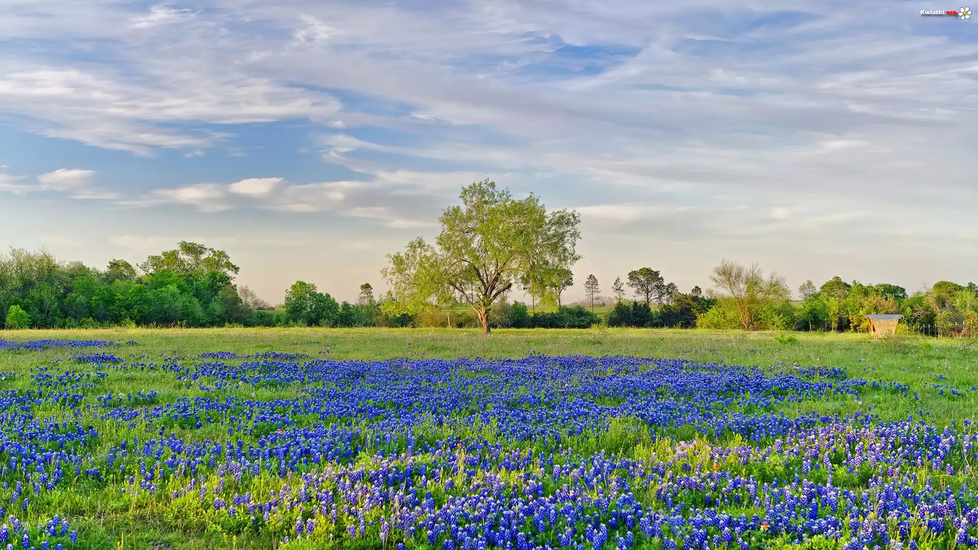 Łąka, Trawa, Niebieskie, Kwiaty, Drzewo - Zdjęcia