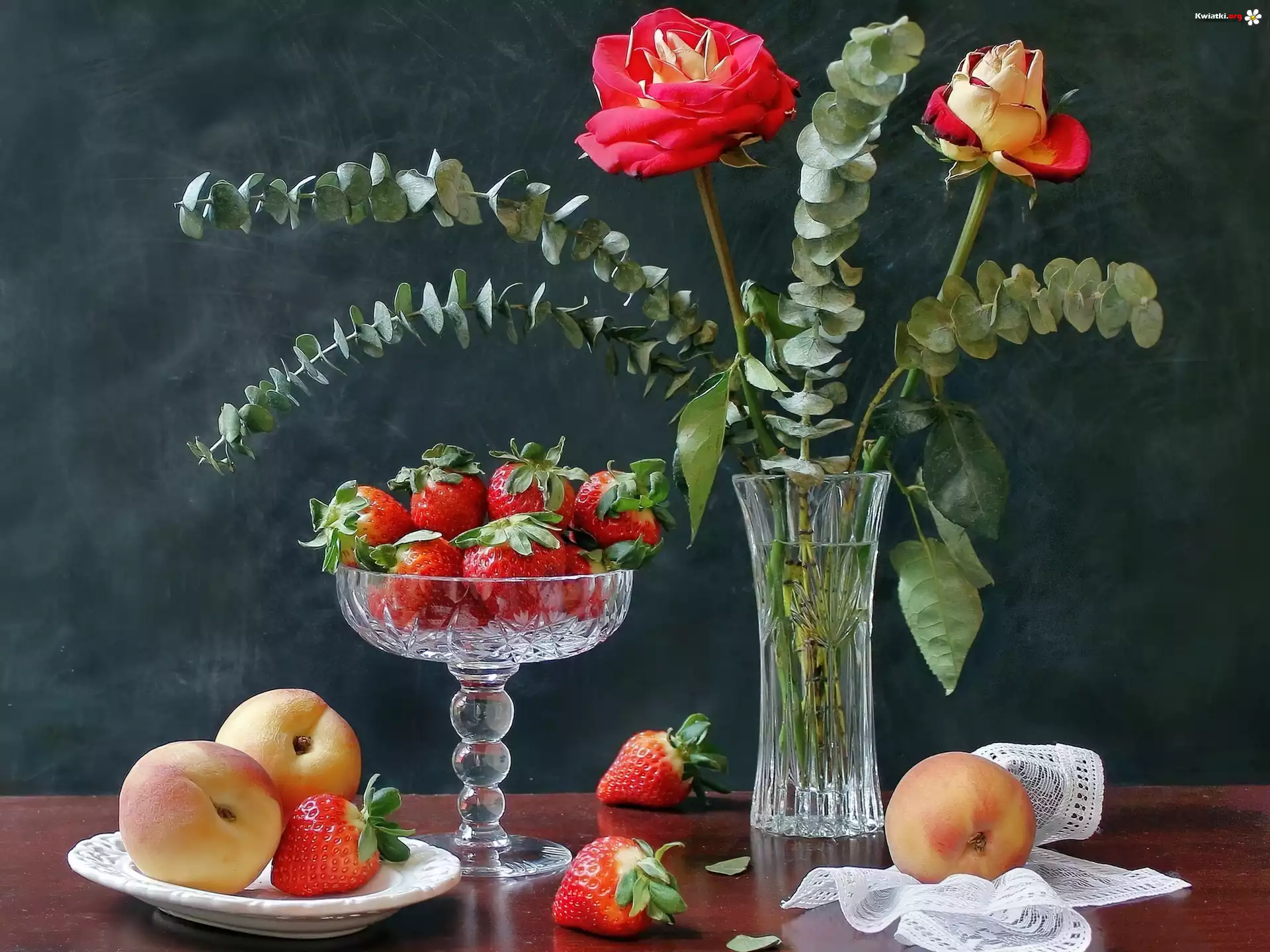 Kwiat Kwiaty, Róże, Patera, Truskawki, Kompozycja