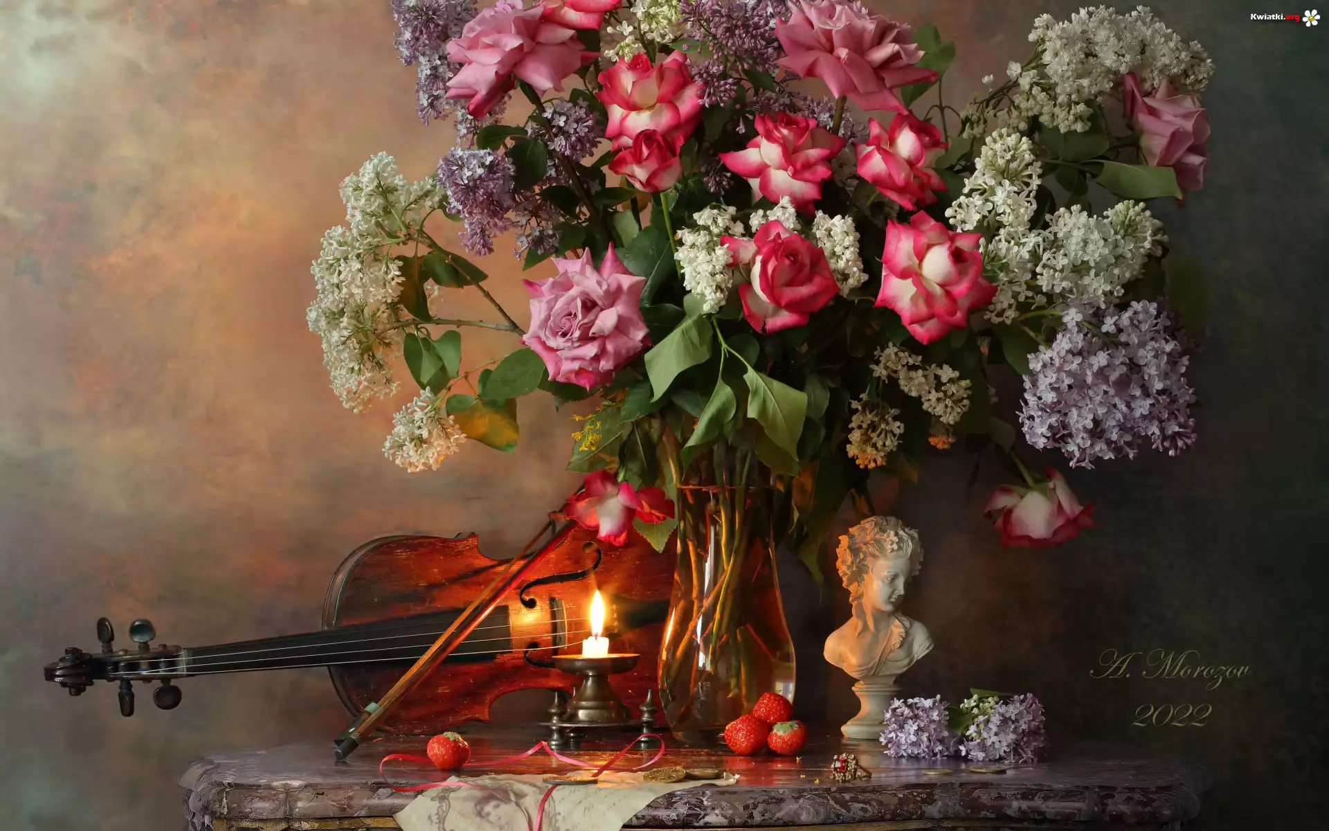 Kwiat Kwiaty, Bukiet, Wazon, Róże, Lilak, Skrzypce, Figurka, Świeca, Truskawki, Kompozycja