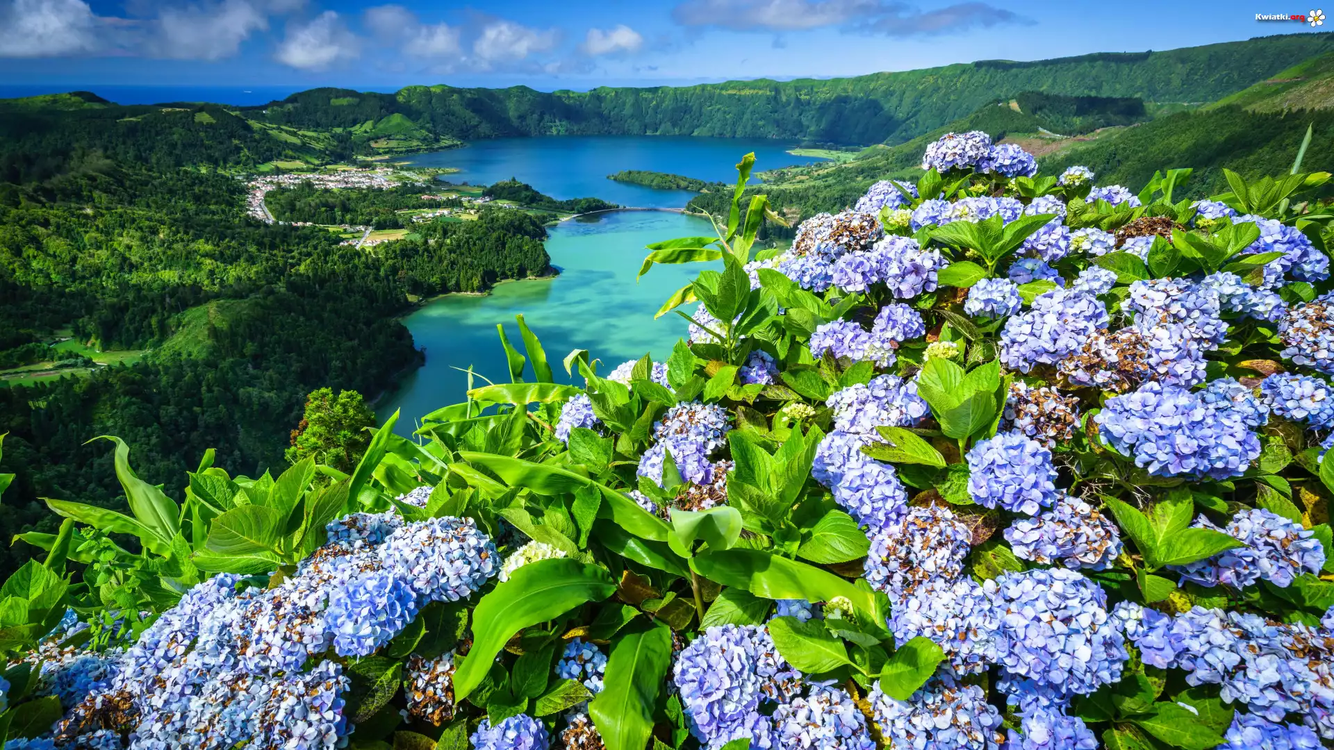 Kwiaty, Hortensje, Jeziora, Jezioro Azul, Jezioro Verde, Azory, Portugalia - Zdjęcia