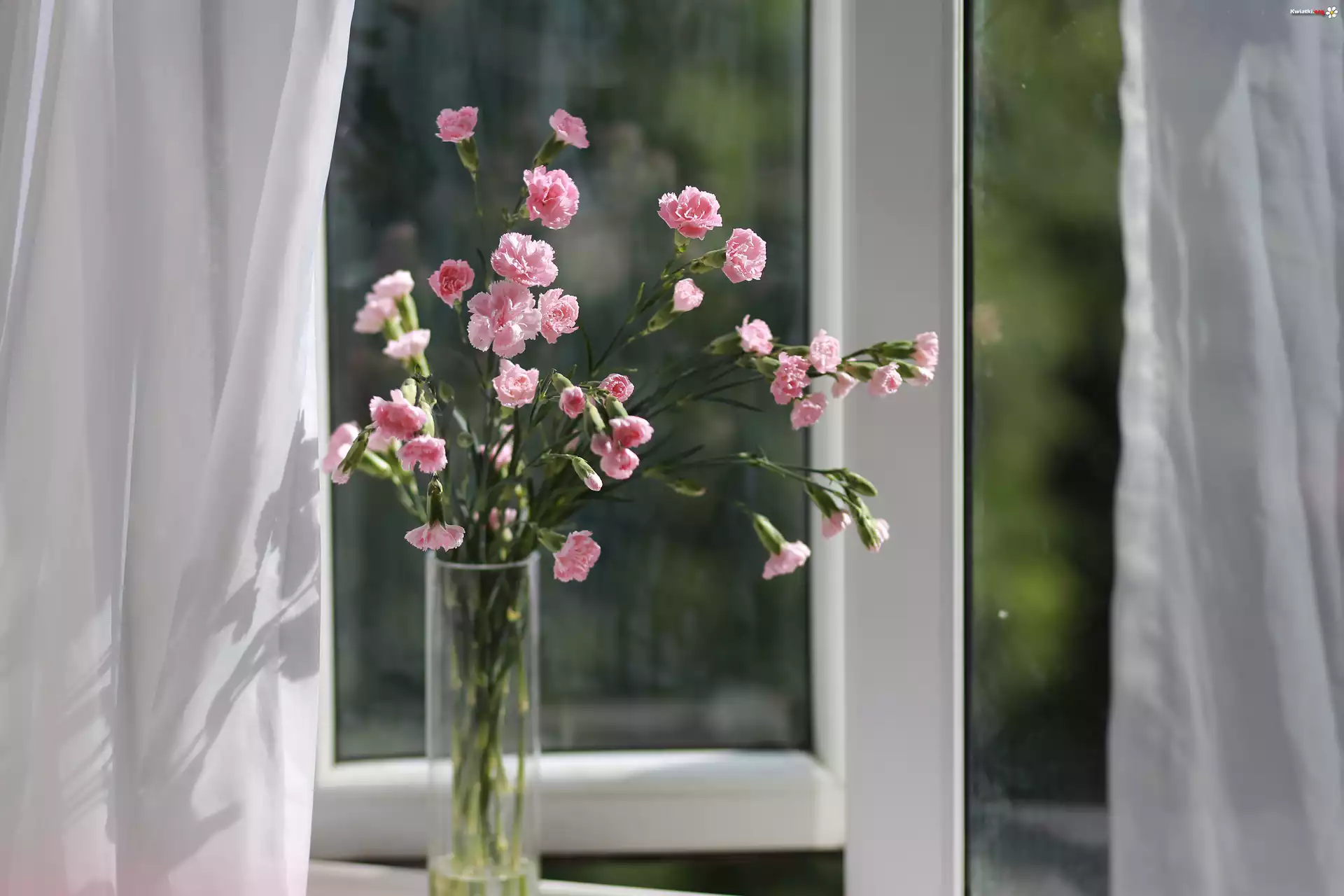 Kwiat Kwiaty, Goździki, Wazon, Okno