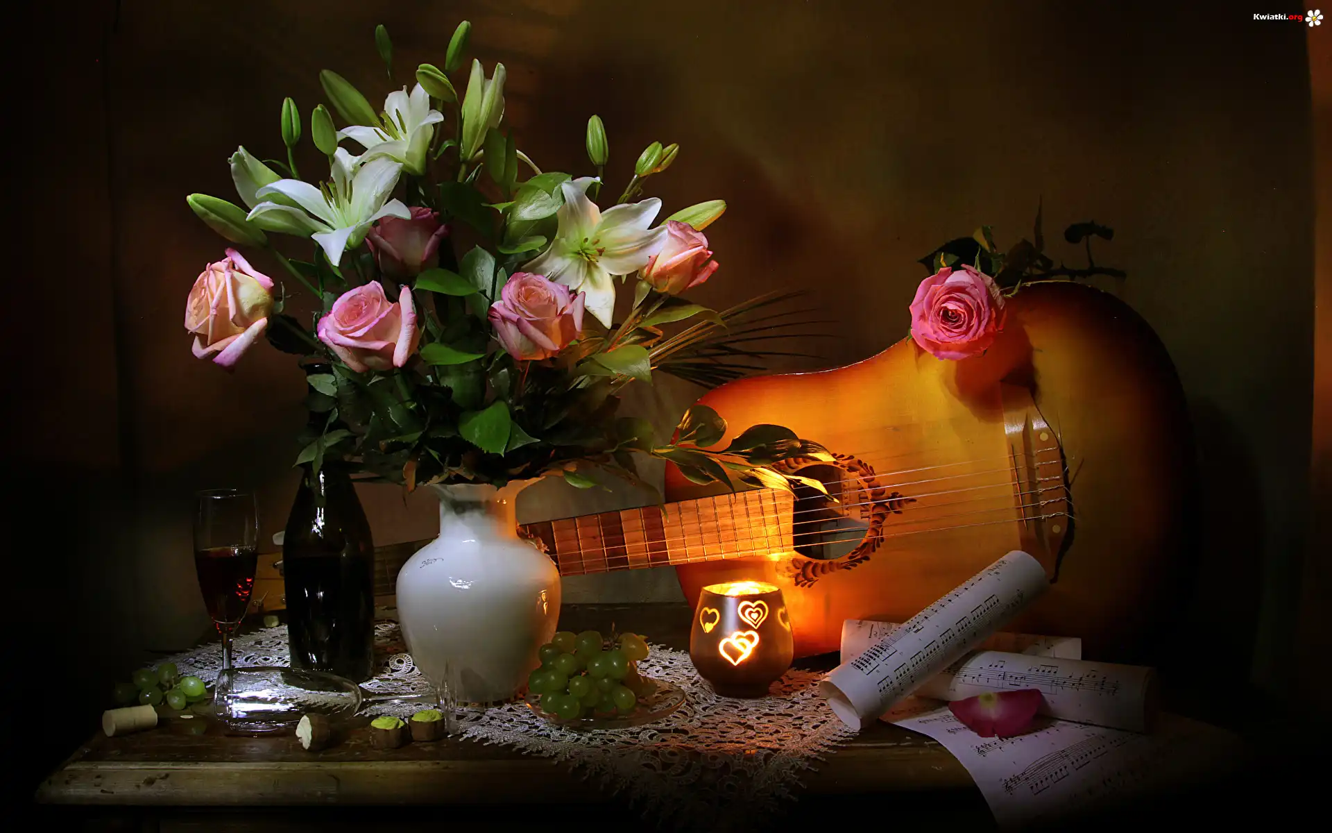 Kwiaty, Róże, Lilie, Świeca, Wino, Winogrona, Nuty, Wazon, Bukiet, Gitara, Butelka, Kieliszek, Kompozycja - Zdjęcia |