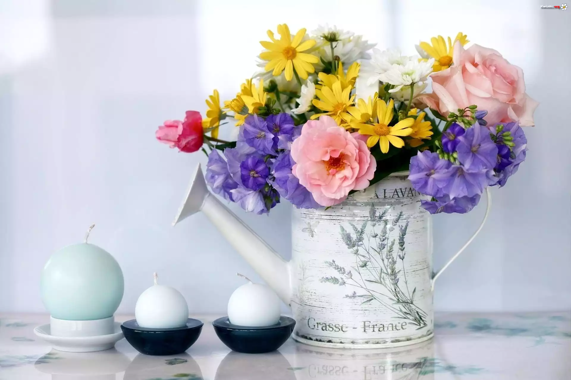 Kwiaty, Konewka, Świeczki, Kompozycja - Zdjęcia