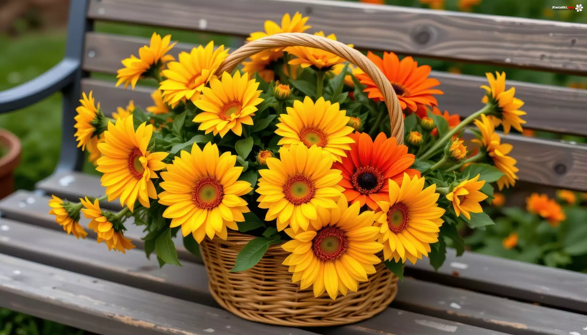 Żółte, Kwiaty, Wiklinowy, Koszyk, Ławka - Zdjęcia