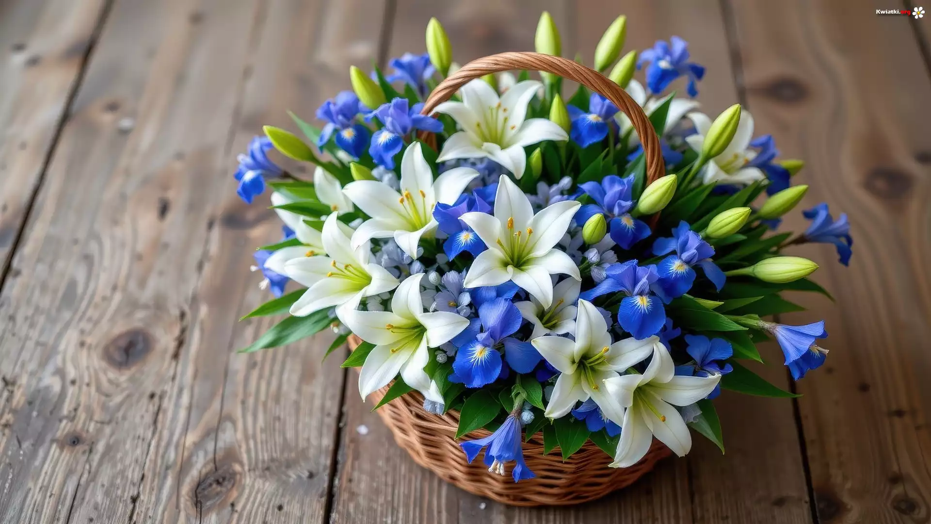 Kwiaty, Bukiet, Niebieskie, Irysy, Białe, Lilie, Wiklinowy, Kosz, Deski - Zdjęcia