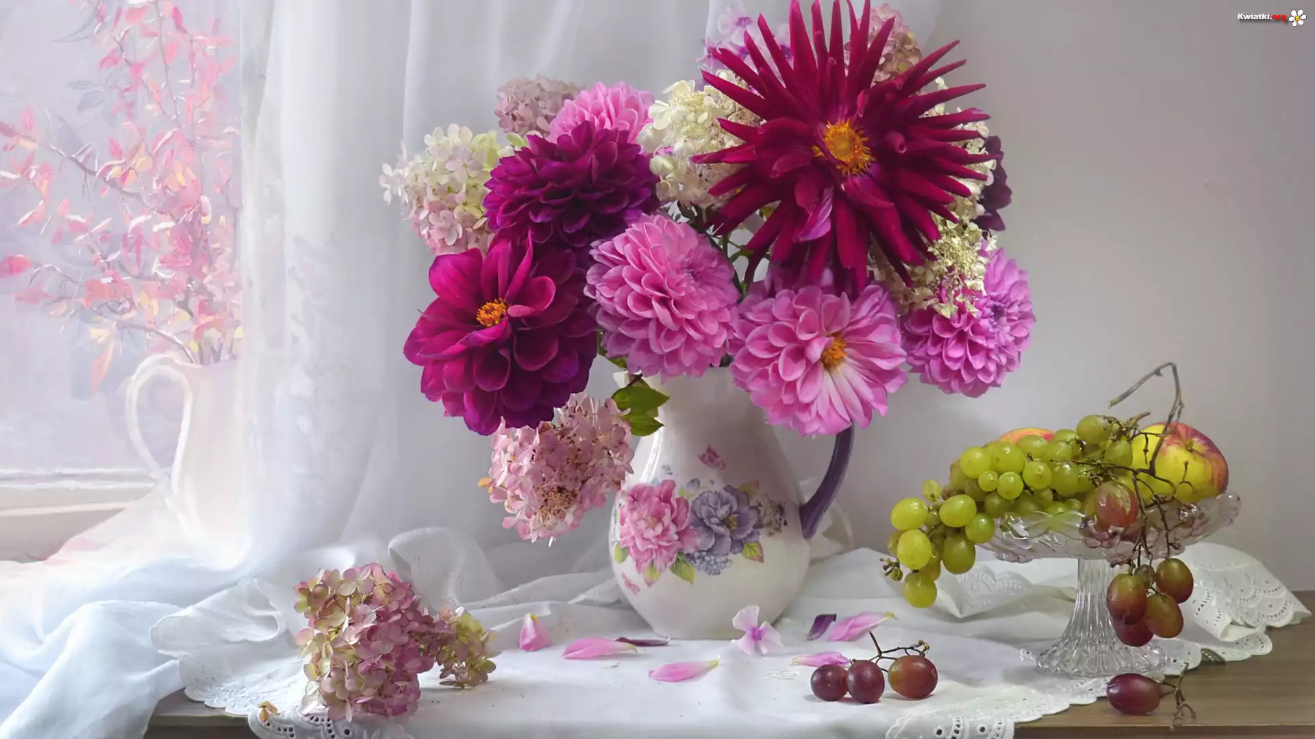 Kwiat Kwiaty, Dzbanek, Dalie, Hortensje, Winogrona, Jabłka