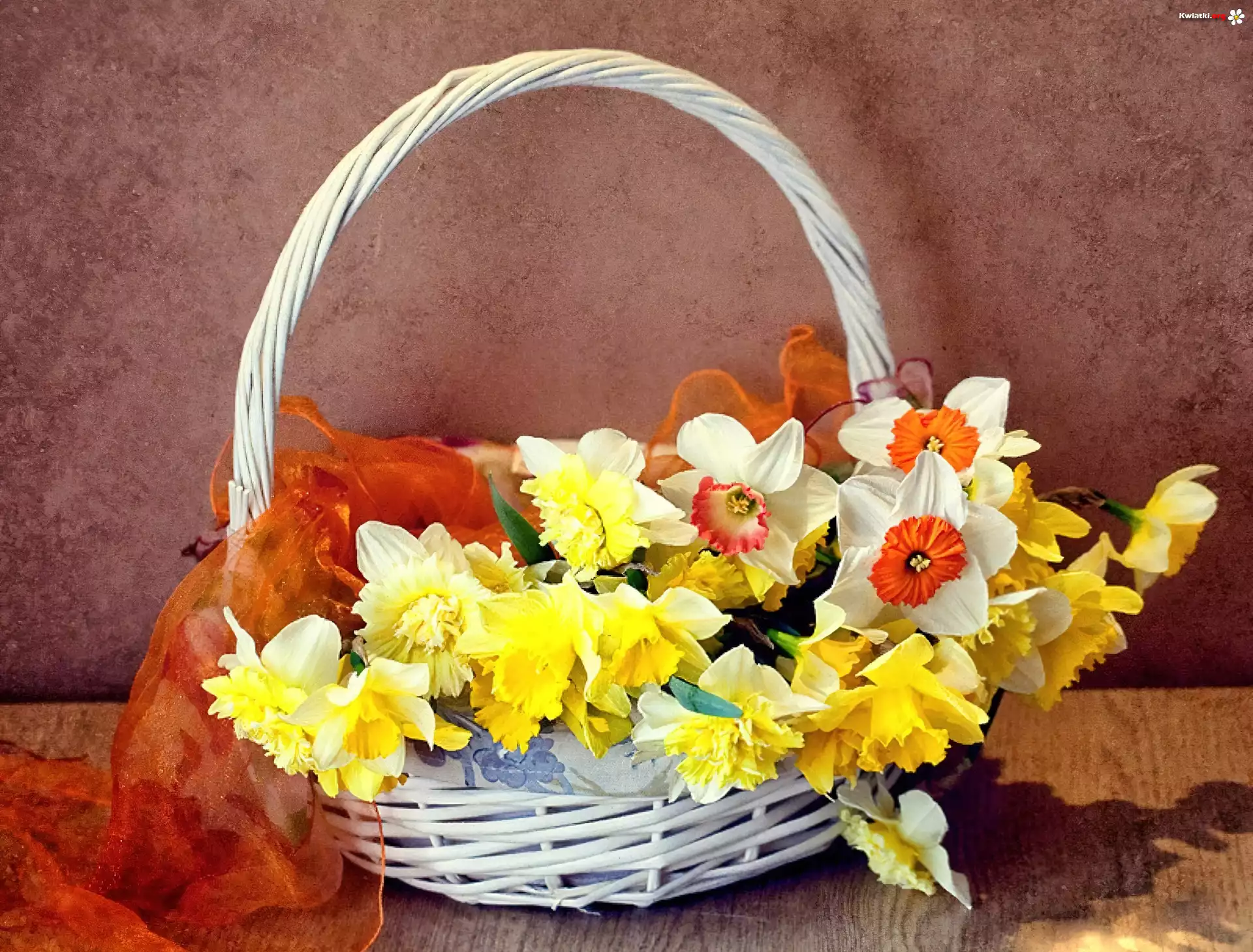 Wiosenne, Kwiaty, Narcyze, Żonkile, Wiklinowy, Koszyk, Apaszka - Zdjęcia
