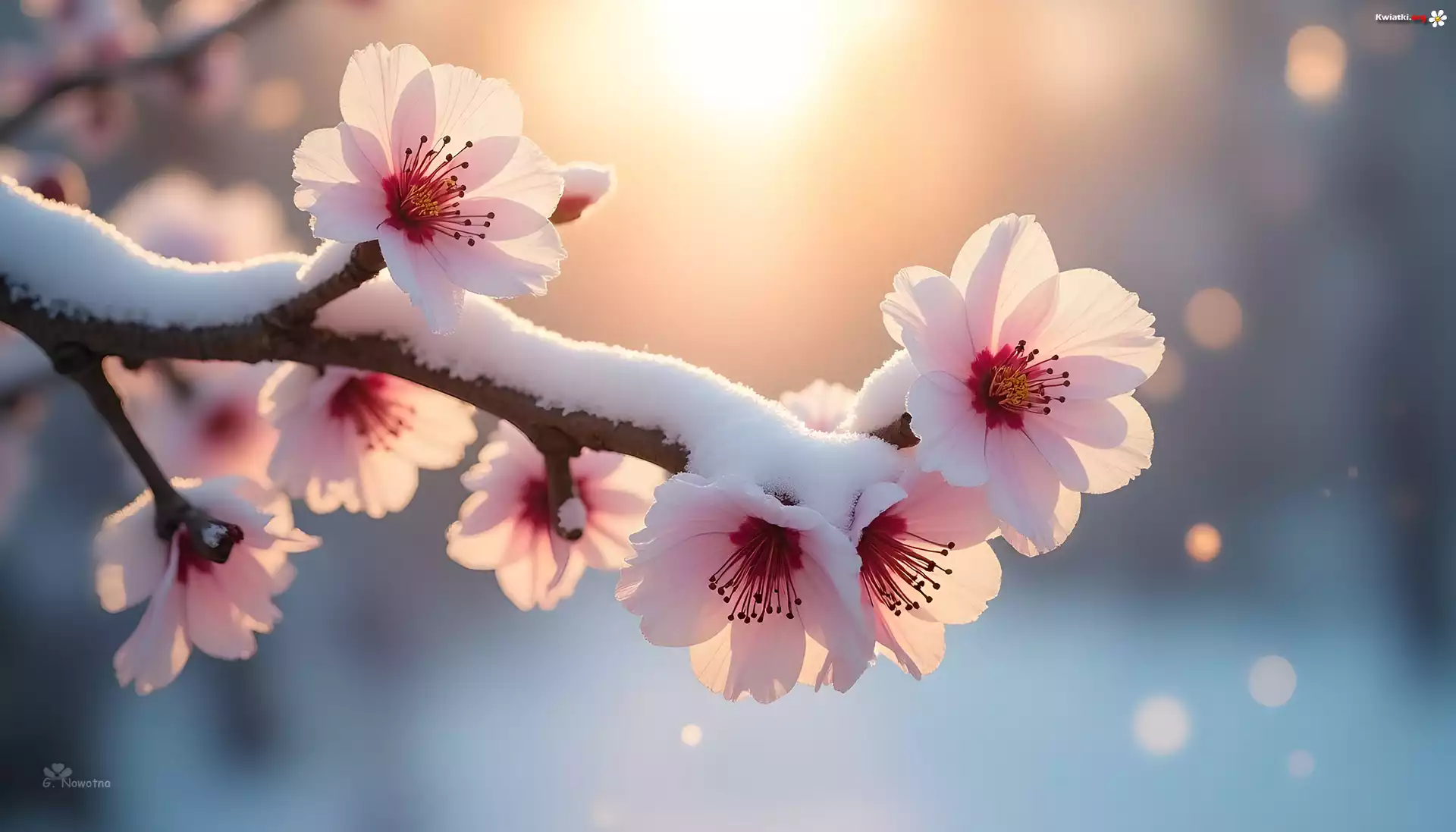 Kwiat Różowe, Kwiaty, Wiśni, Ośnieżona, Gałązka