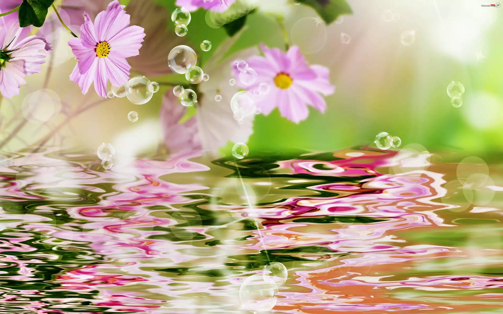 Kwiaty, Kosmea, Rozmyta, Woda, Odbicie - Zdjęcia
