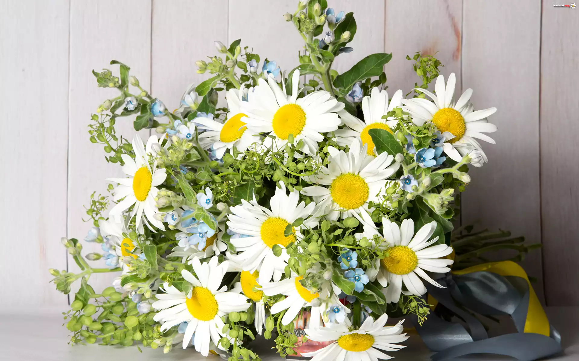 Kwiat Kwiaty, Bukiet, Margerytki, Wstążki, Deski