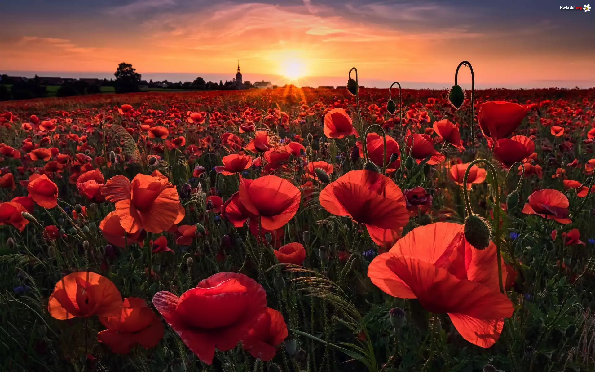 Kwiat Kwiaty, Maki, Pole, Zachód słońca