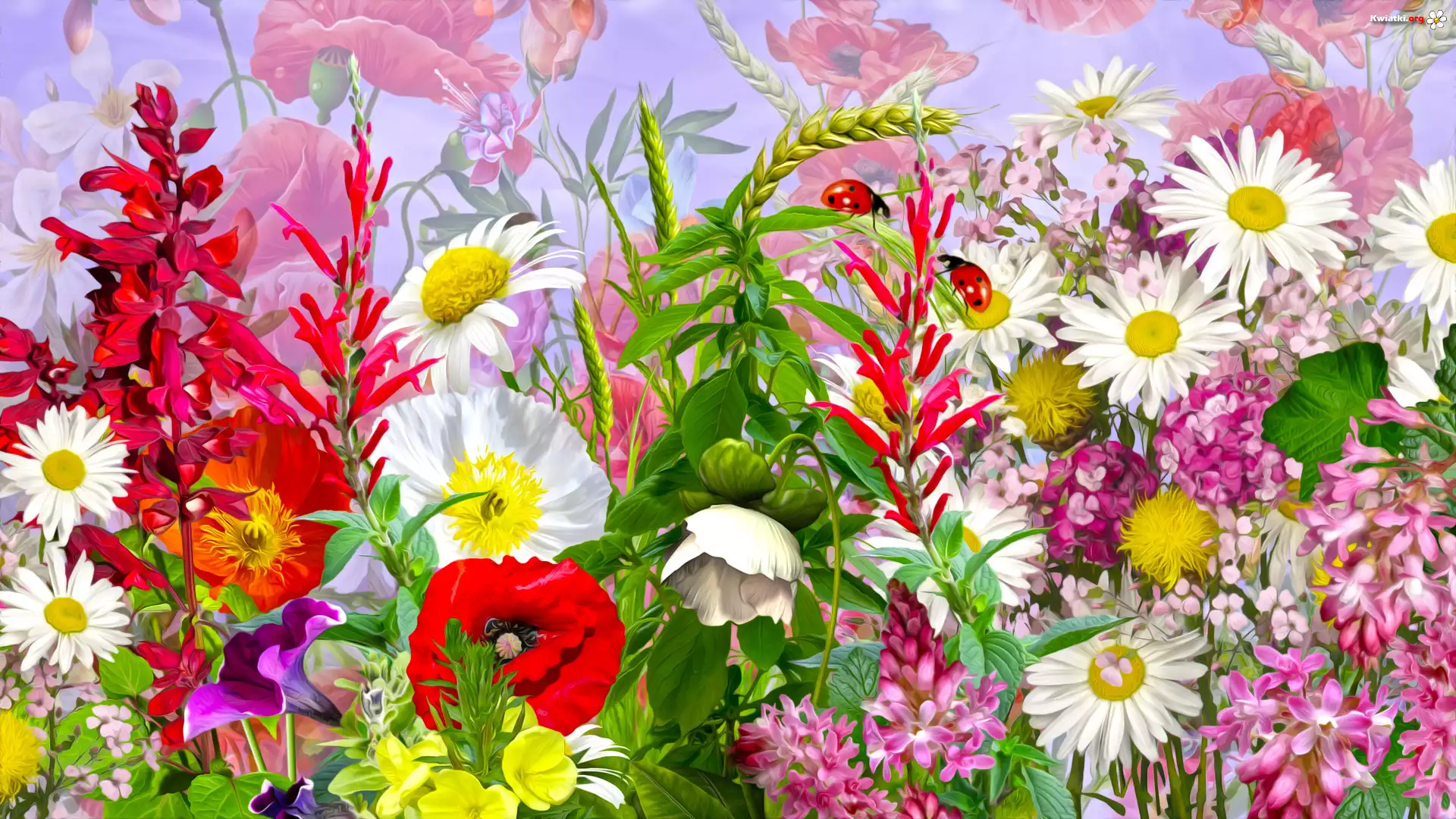 Kwiaty, Biedronki, Zboże, Grafika - Zdjęcia