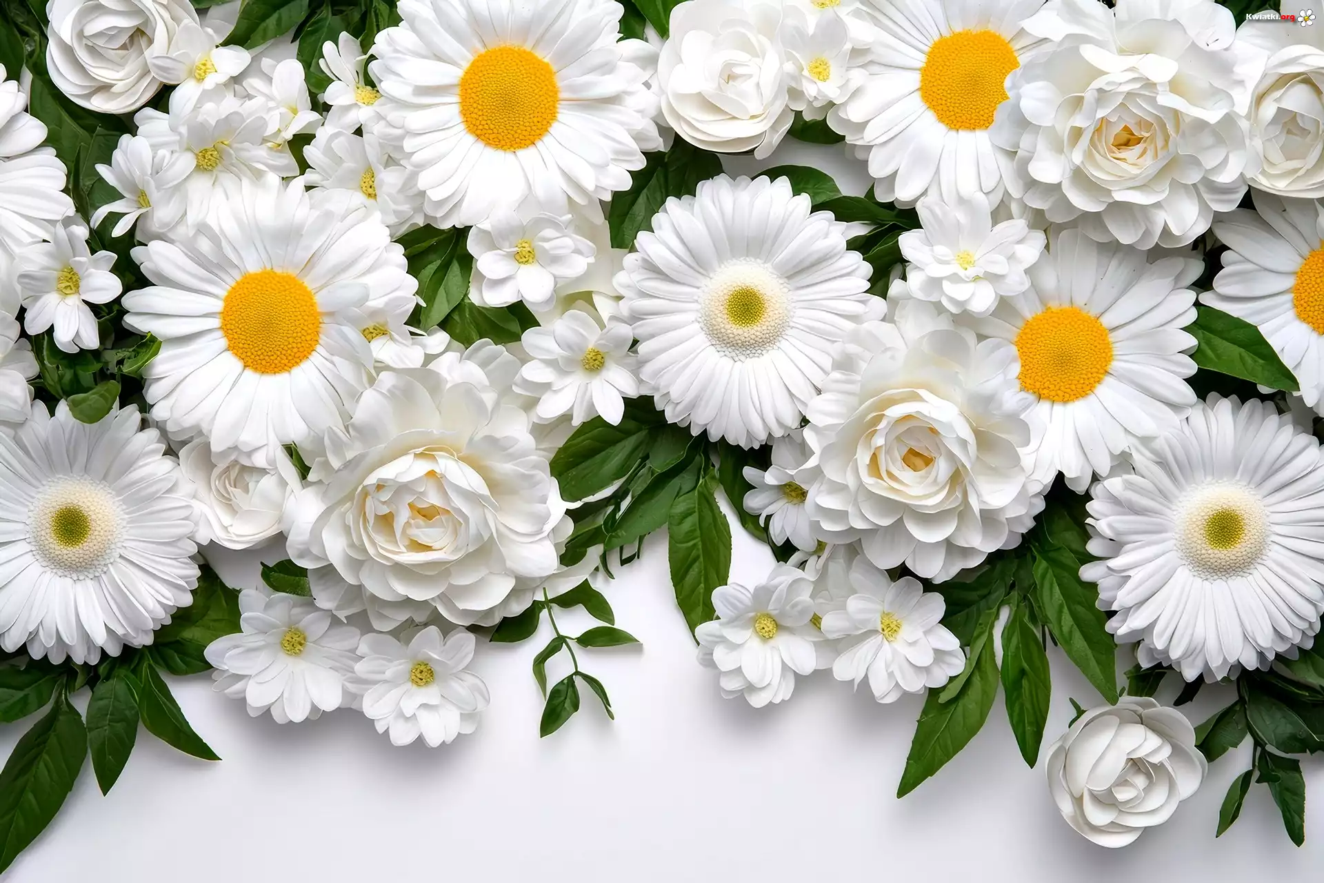 Białe, Kwiaty, Zielone, Listki, Grafika - Zdjęcia