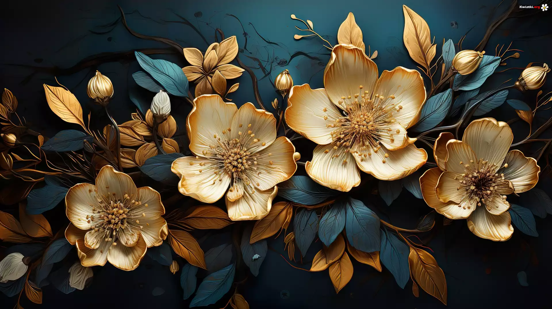 Złote, Kwiaty, Zielone, Listki, Grafika - Zdjęcia