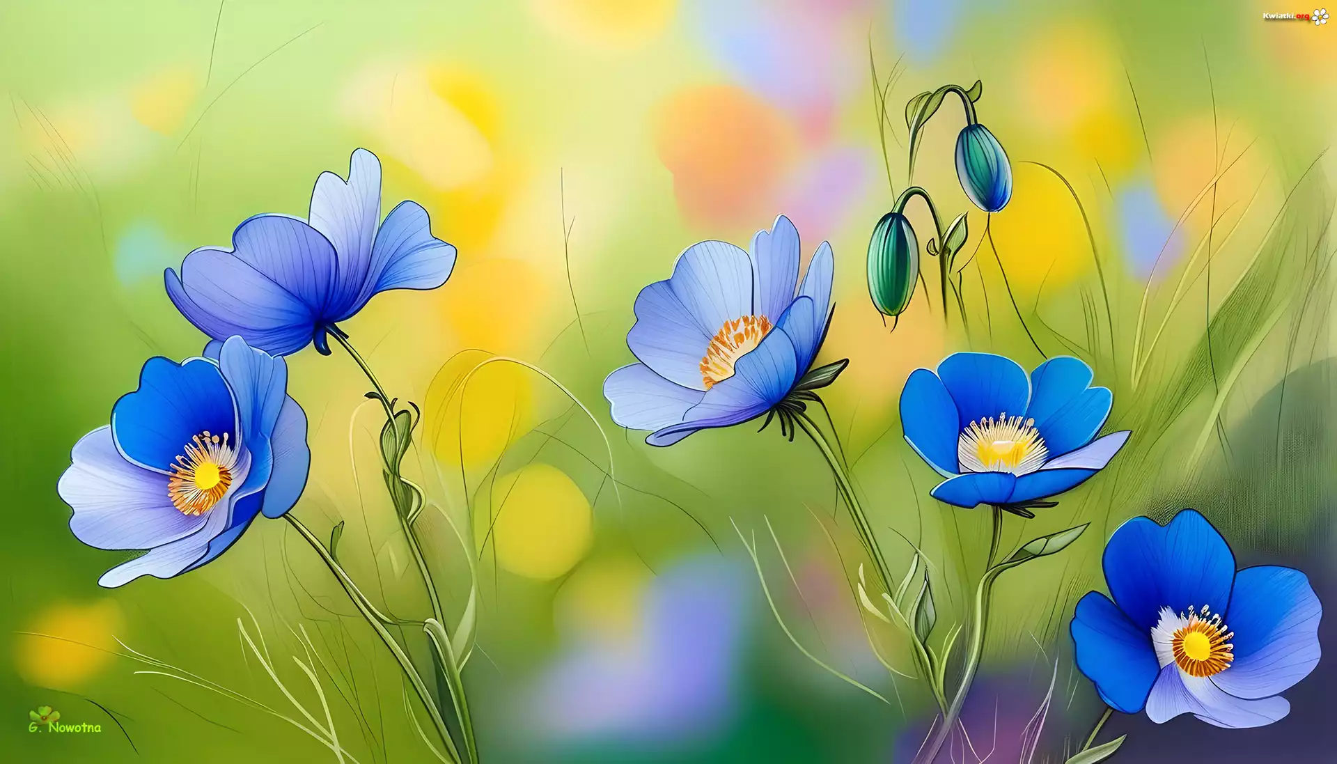 Niebieskie, Kwiaty, Zielone, Tło, Grafika - Zdjęcia