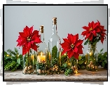 Kwiaty, Gwiazda betlejemska, Butelki, Słoiki, Świeca, Zielone, Rośliny, Kompozycja - Zdjęcia