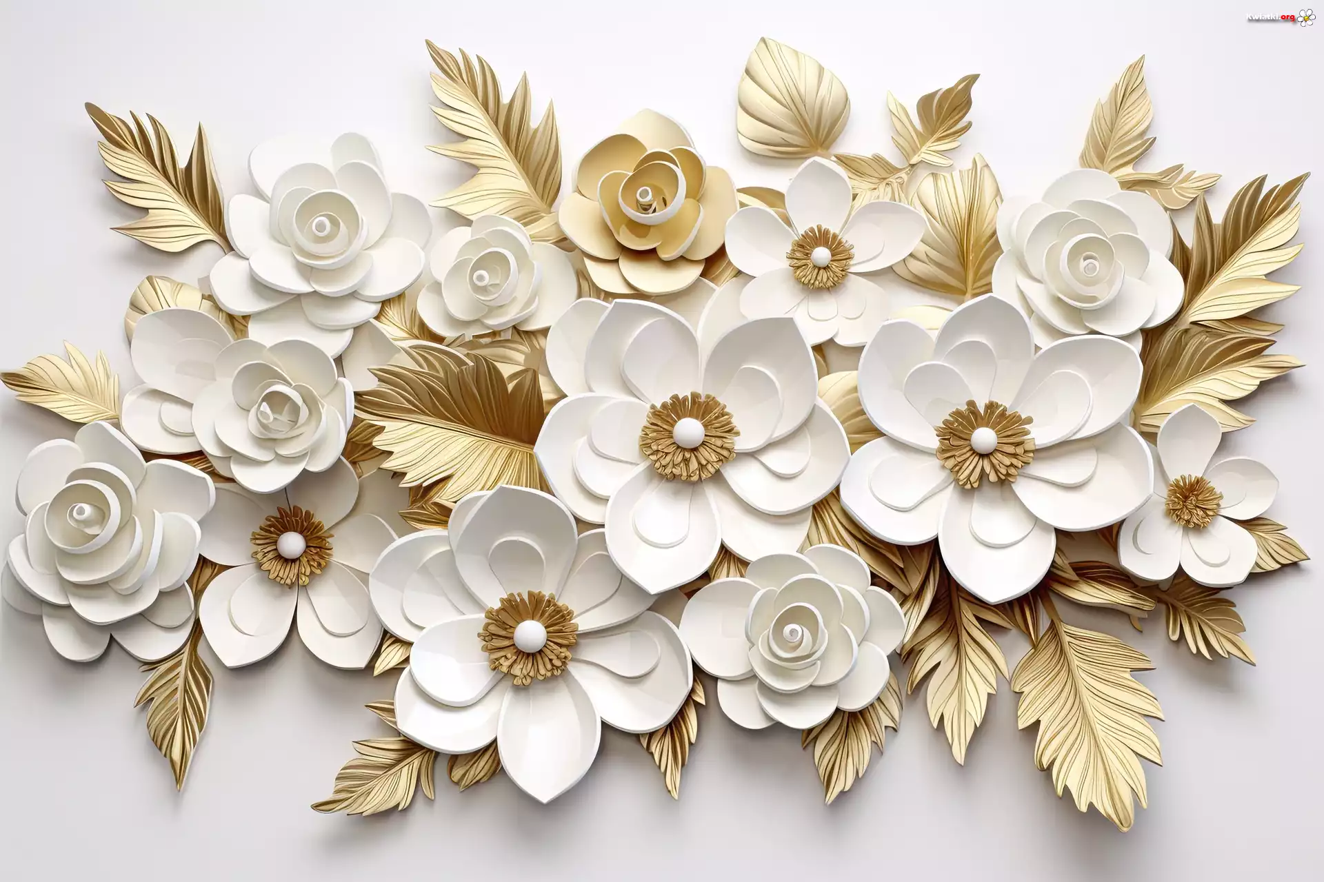 Białe, Kwiaty, Złote, Liście, Grafika - Zdjęcia